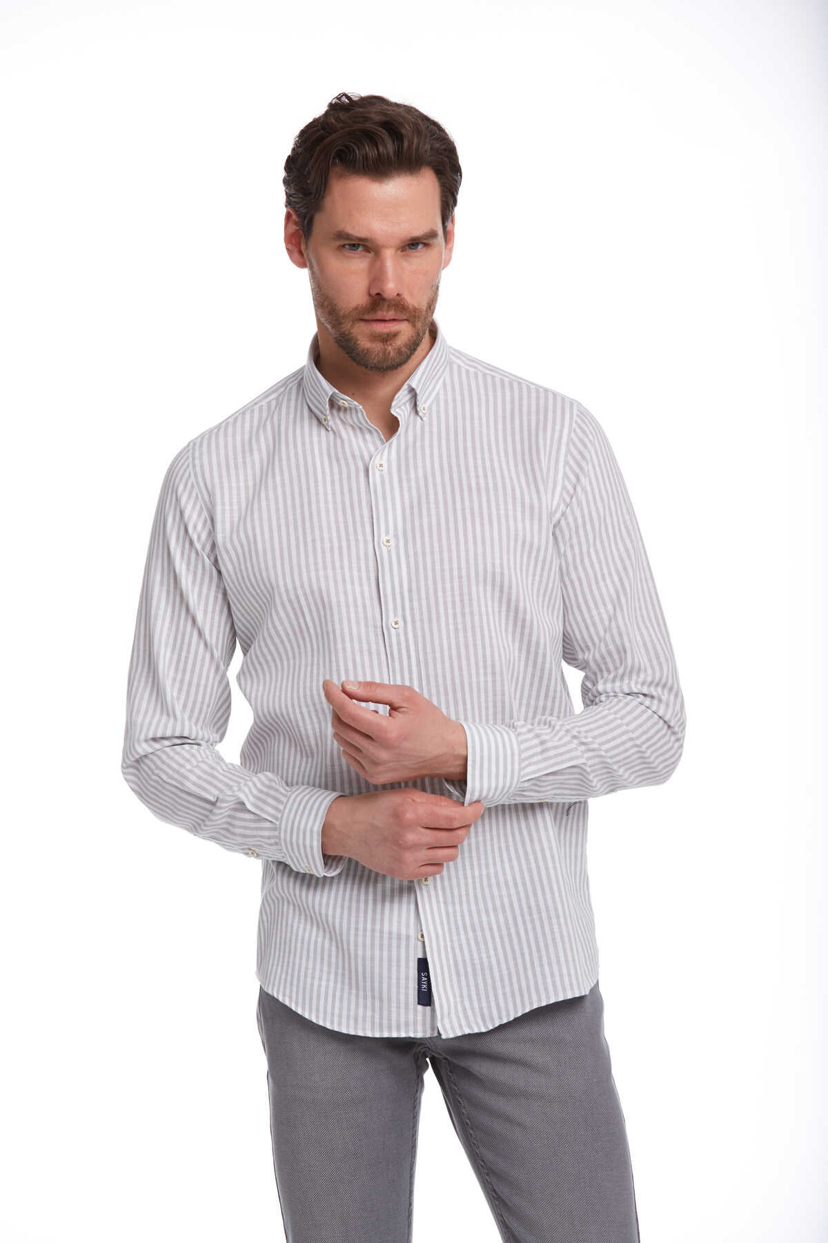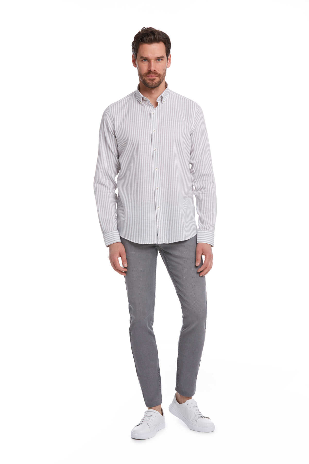 Gri Comfort Fit Çizgili 100% Pamuk Düğmeli Yaka Uzun Kollu Casual Gömlek
