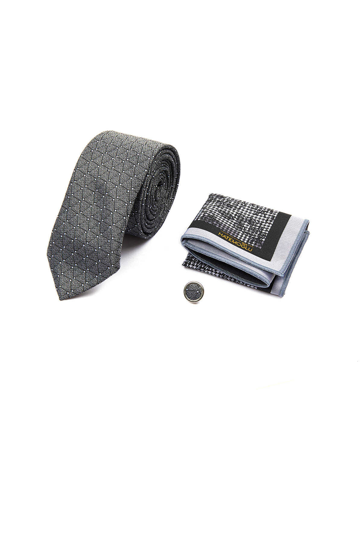 Gri Üçlü Yaka Rozeti Kravat Mendil Set