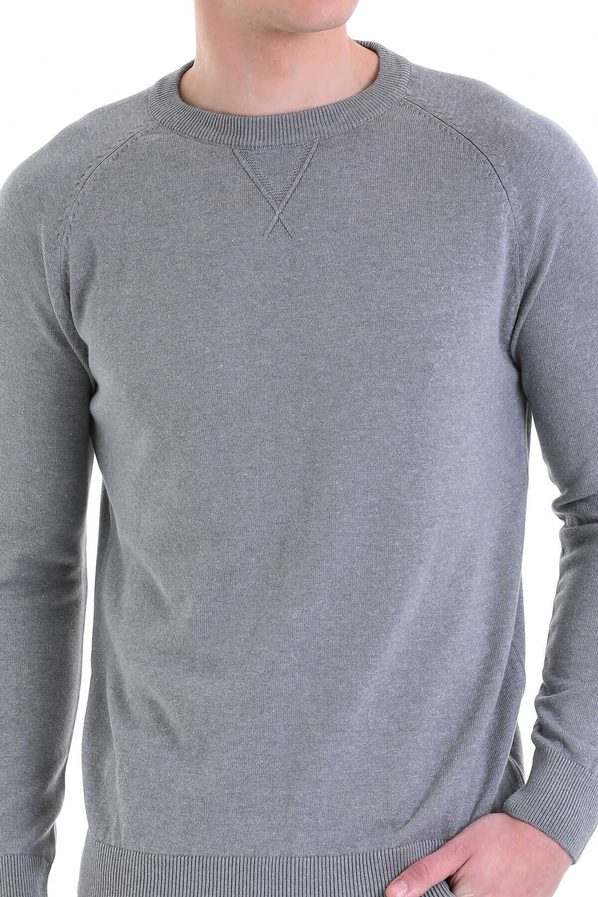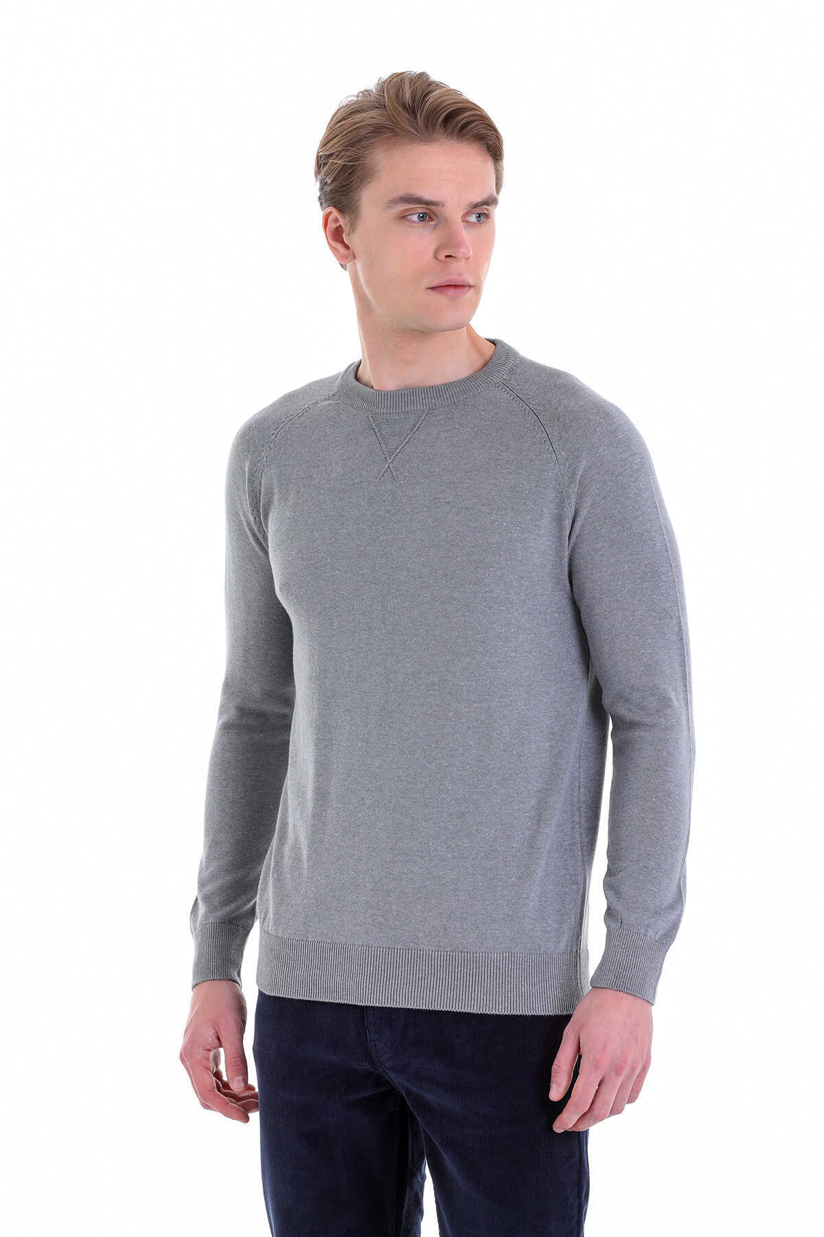 Gri Slim Fit Desenli Pamuklu Bisiklet Yaka Triko Kazak