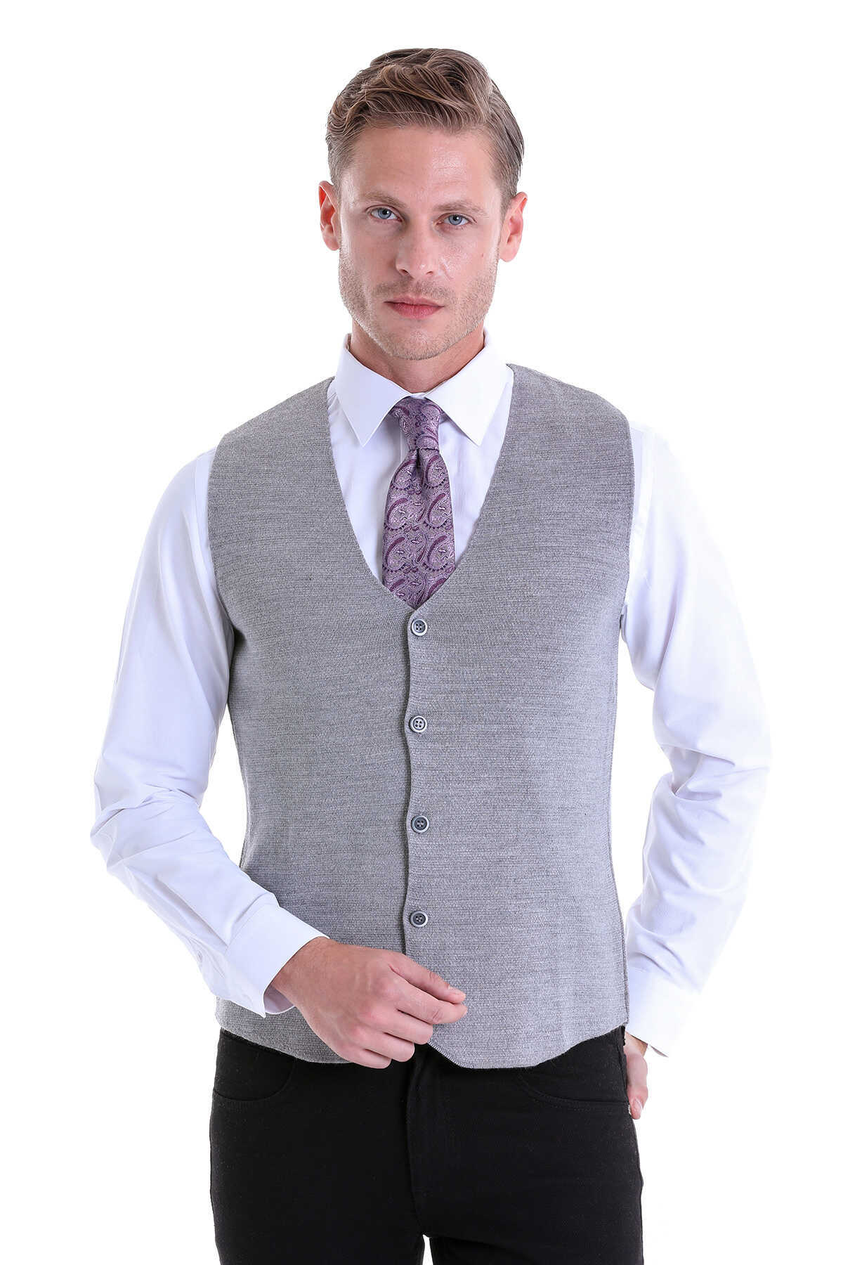 Gri Comfort Fit V Yaka Yünlü Klasik Triko Yelek