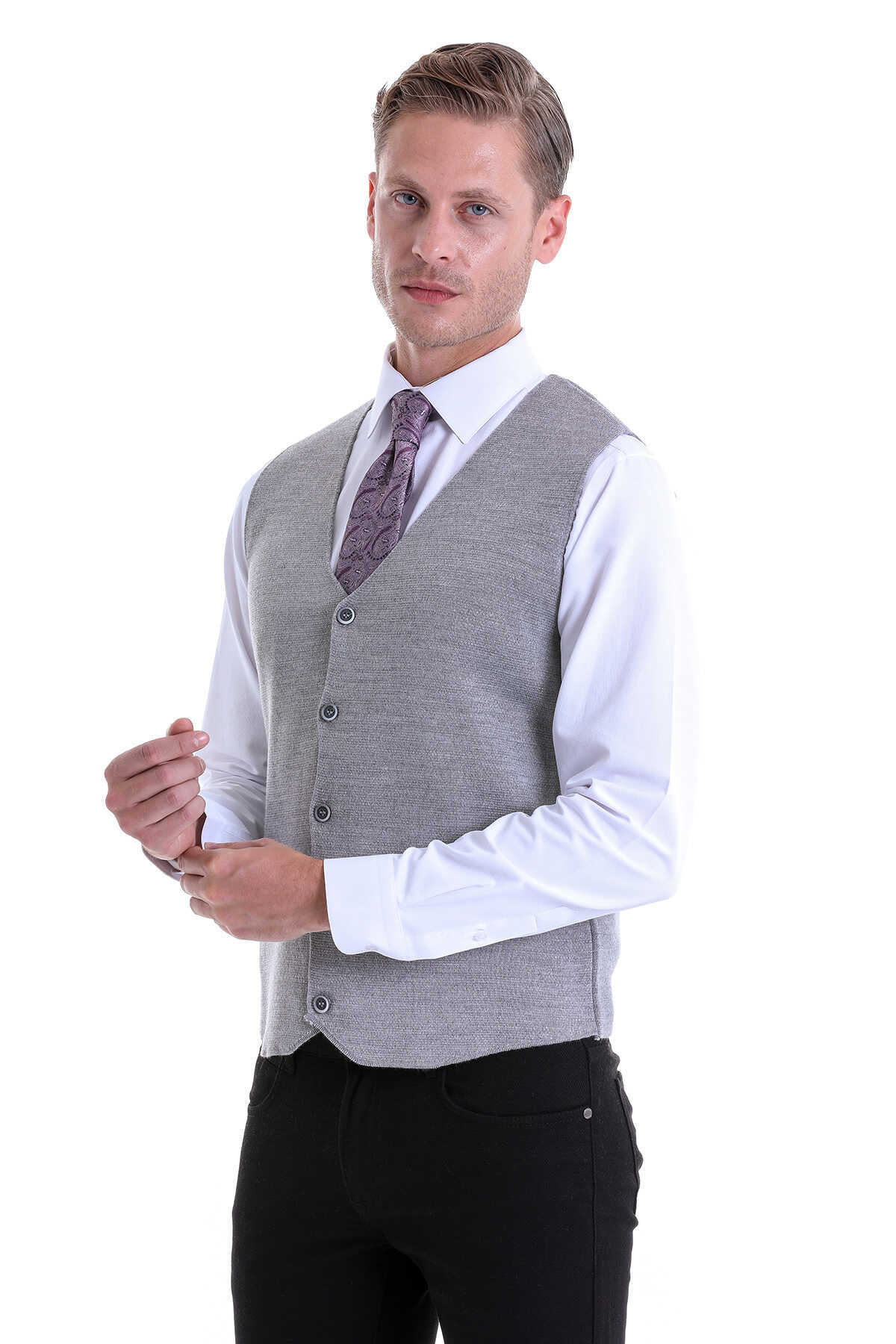 Gri Comfort Fit V Yaka Yünlü Klasik Triko Yelek - 6