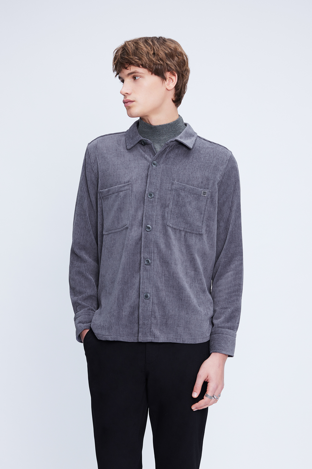 Gri Regular Fit Shacket Uzun Kol Fitilli Kadife Gömlek - 5