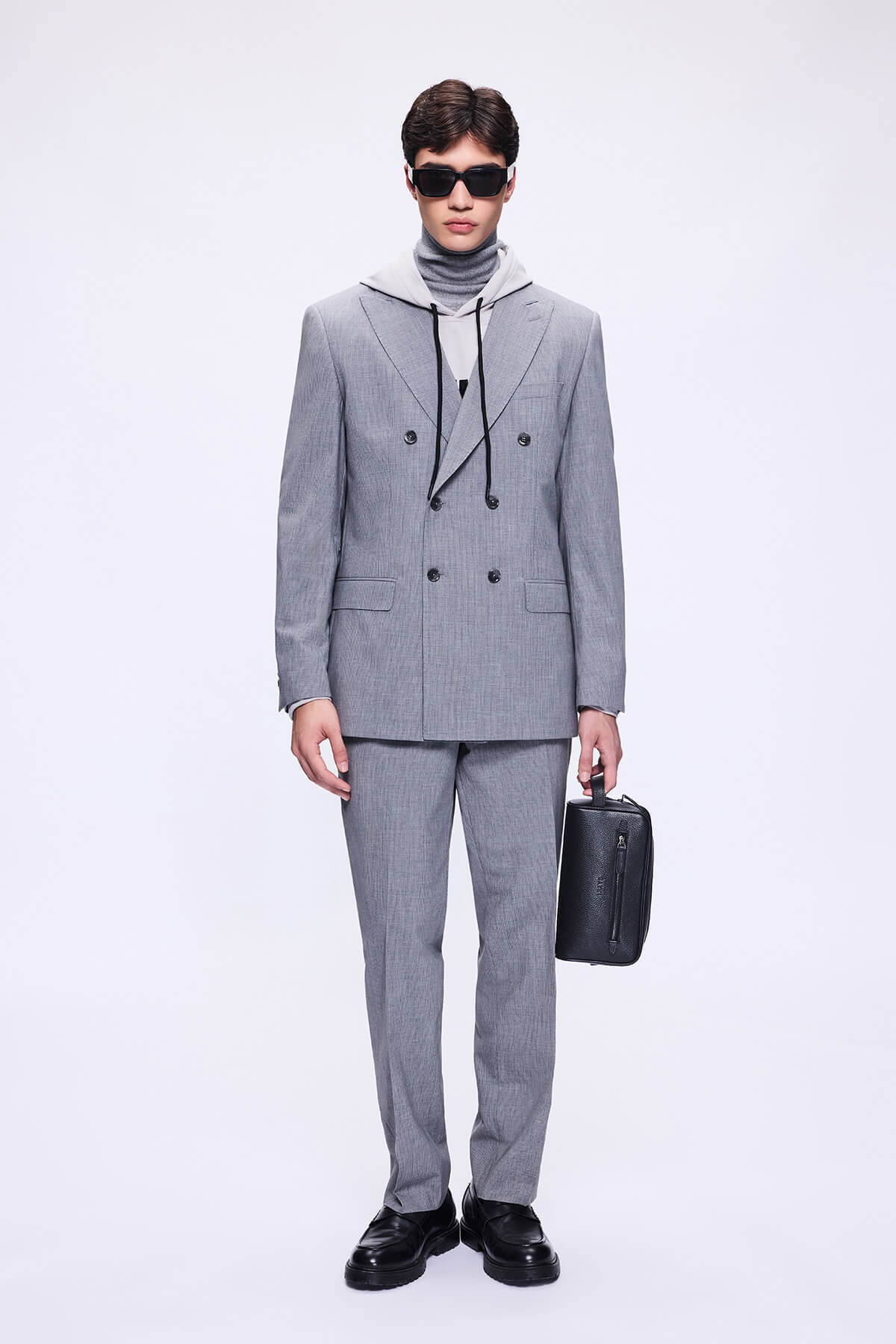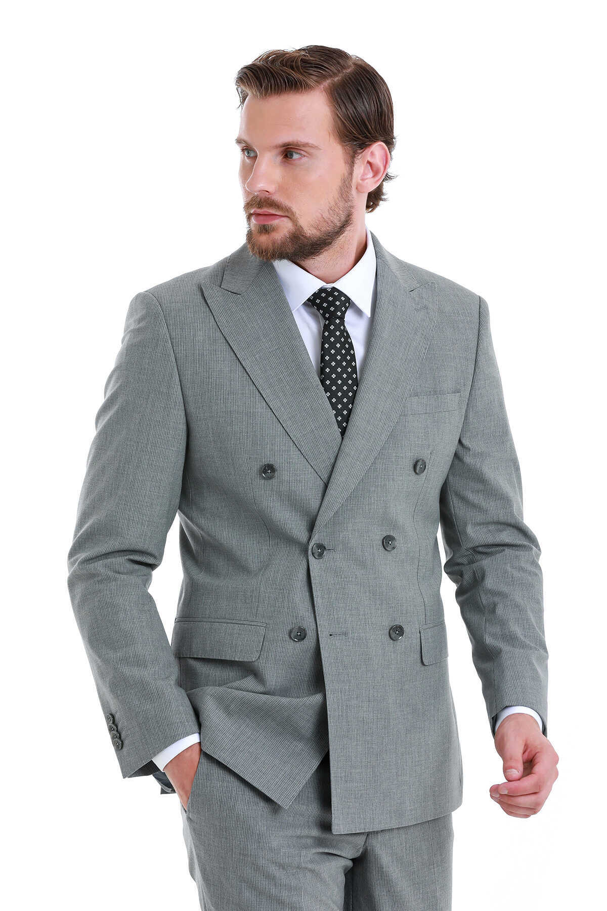 Gri Slim Fit Çizgili Kruvaze Takım Elbise