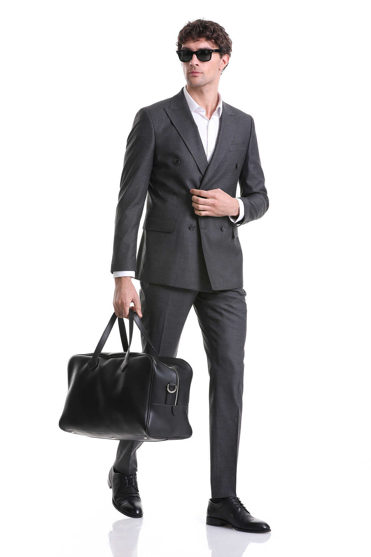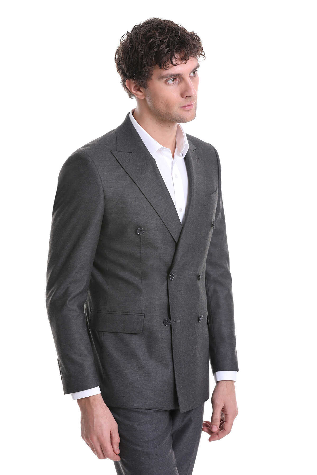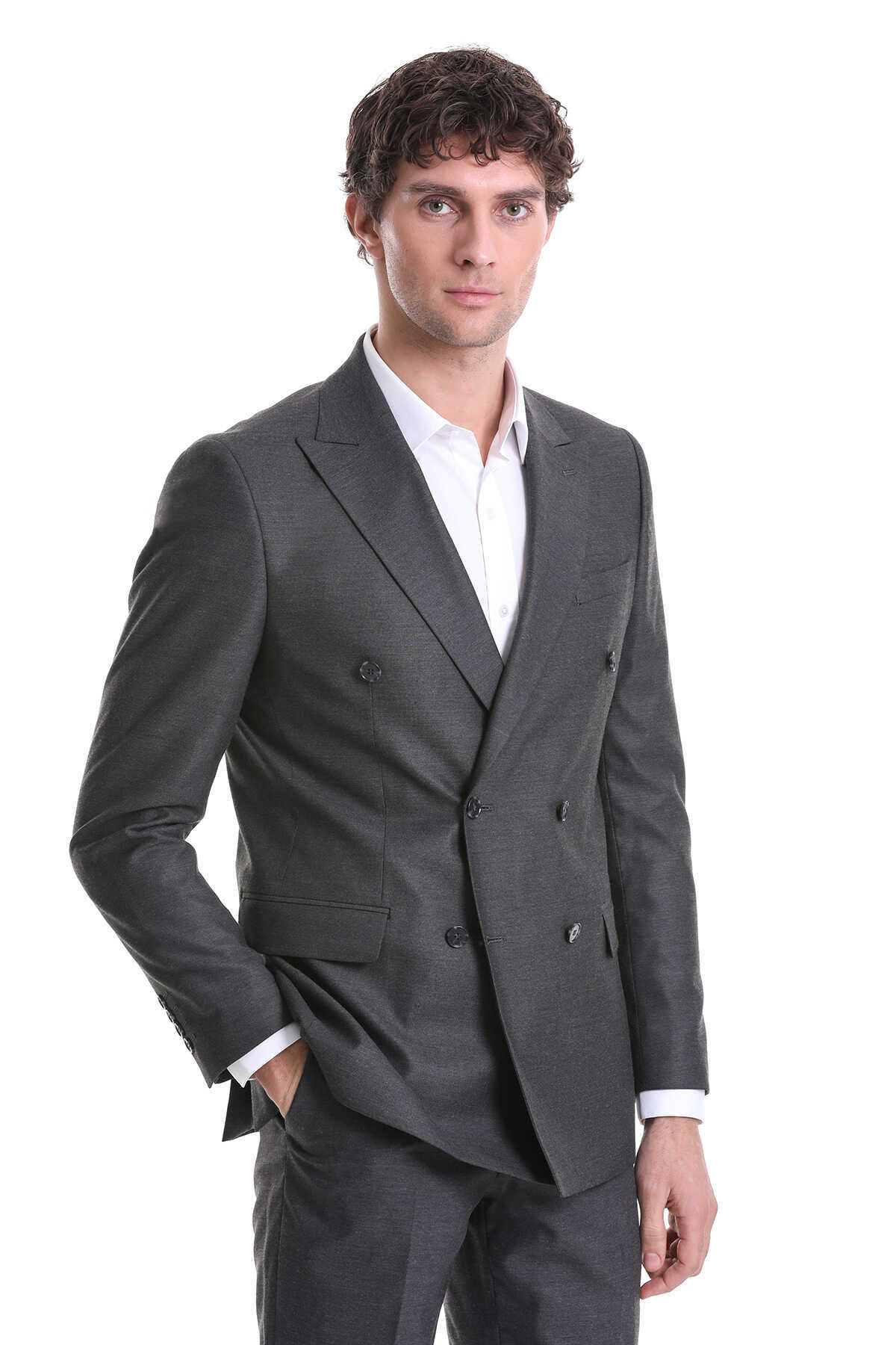 Gri Slim Fit Kruvaze Klasik Takım Elbise
