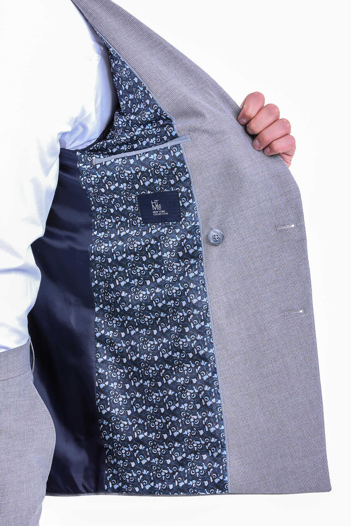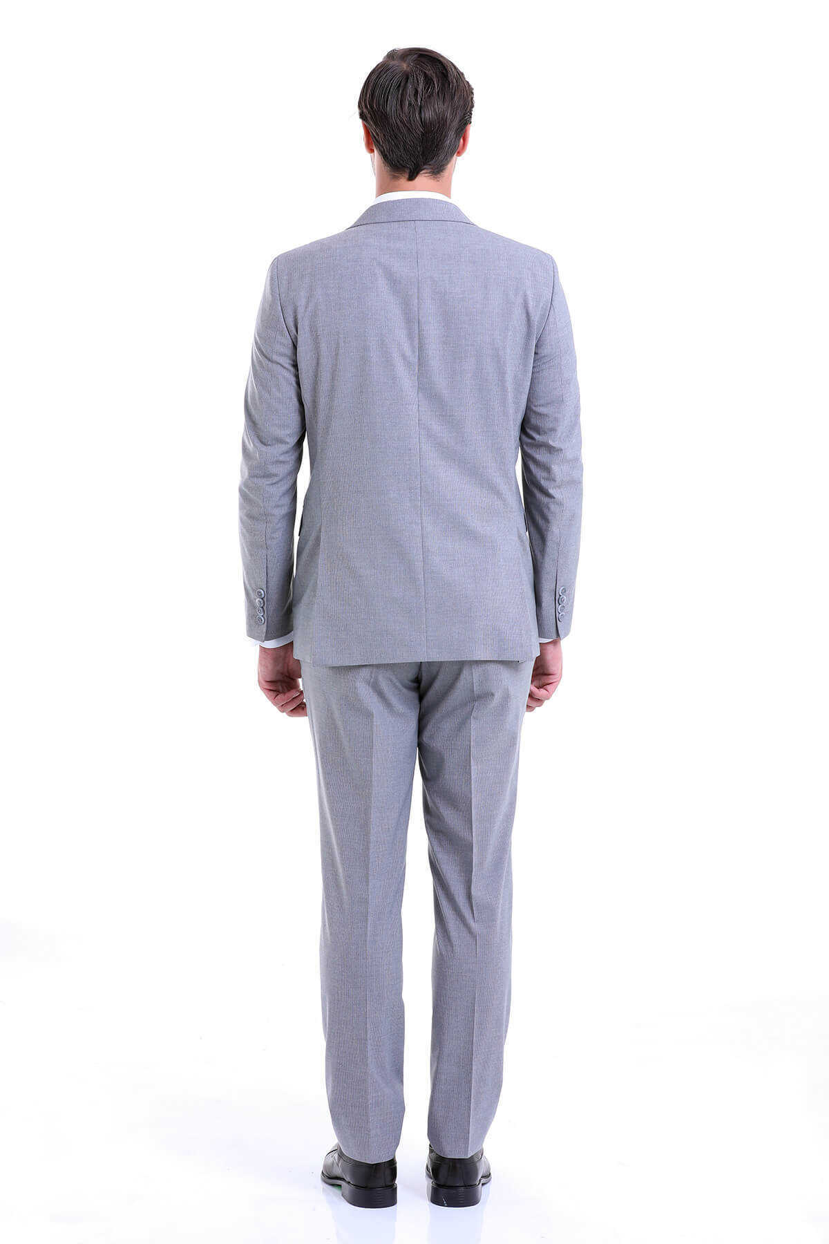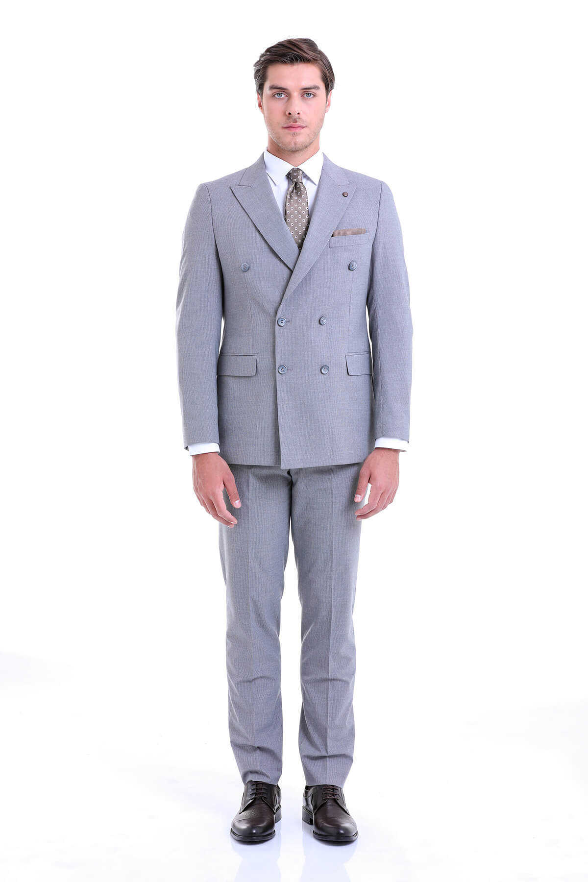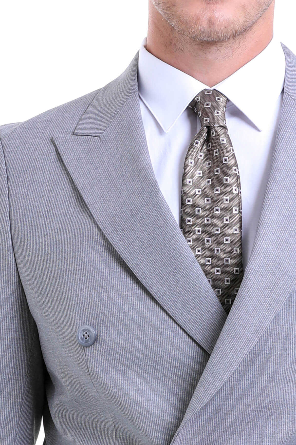 Gri Slim Fit Çizgili Sivri Yaka Casual Kruvaze Takım Elbise