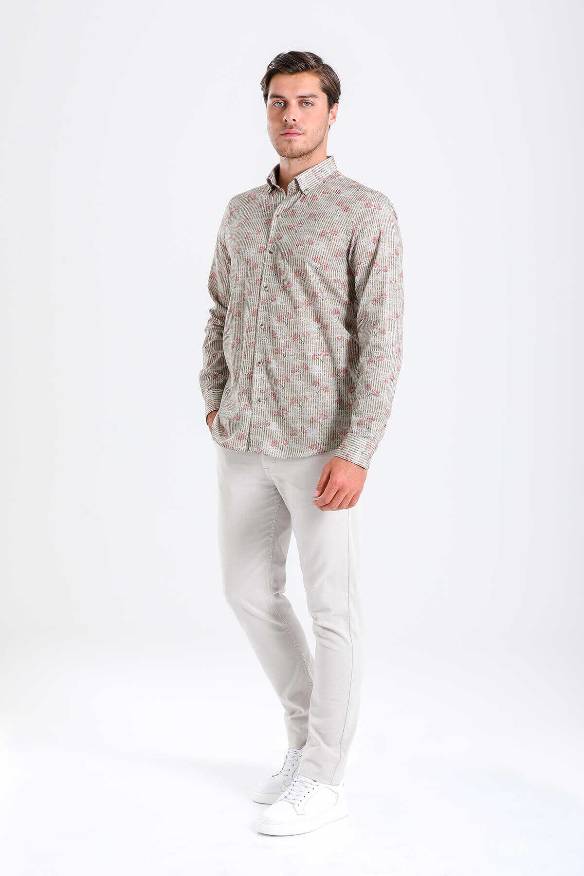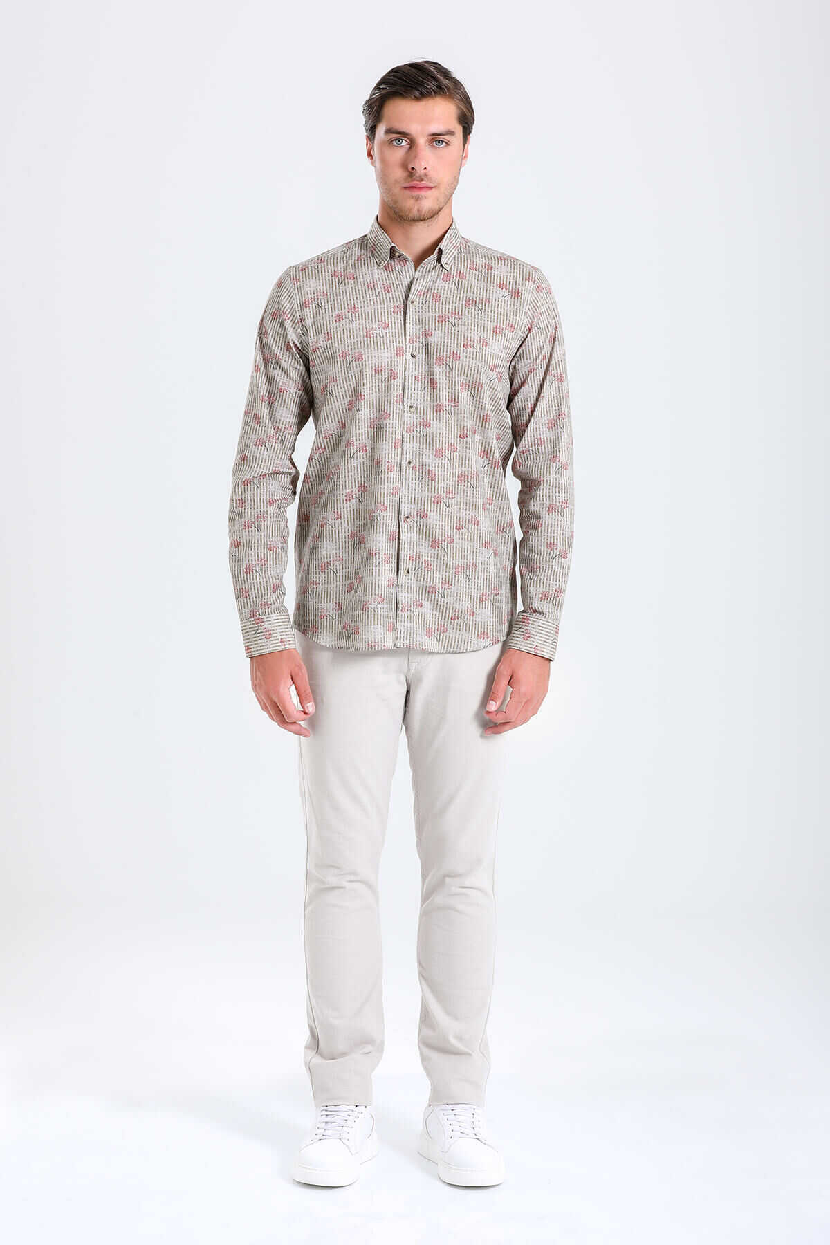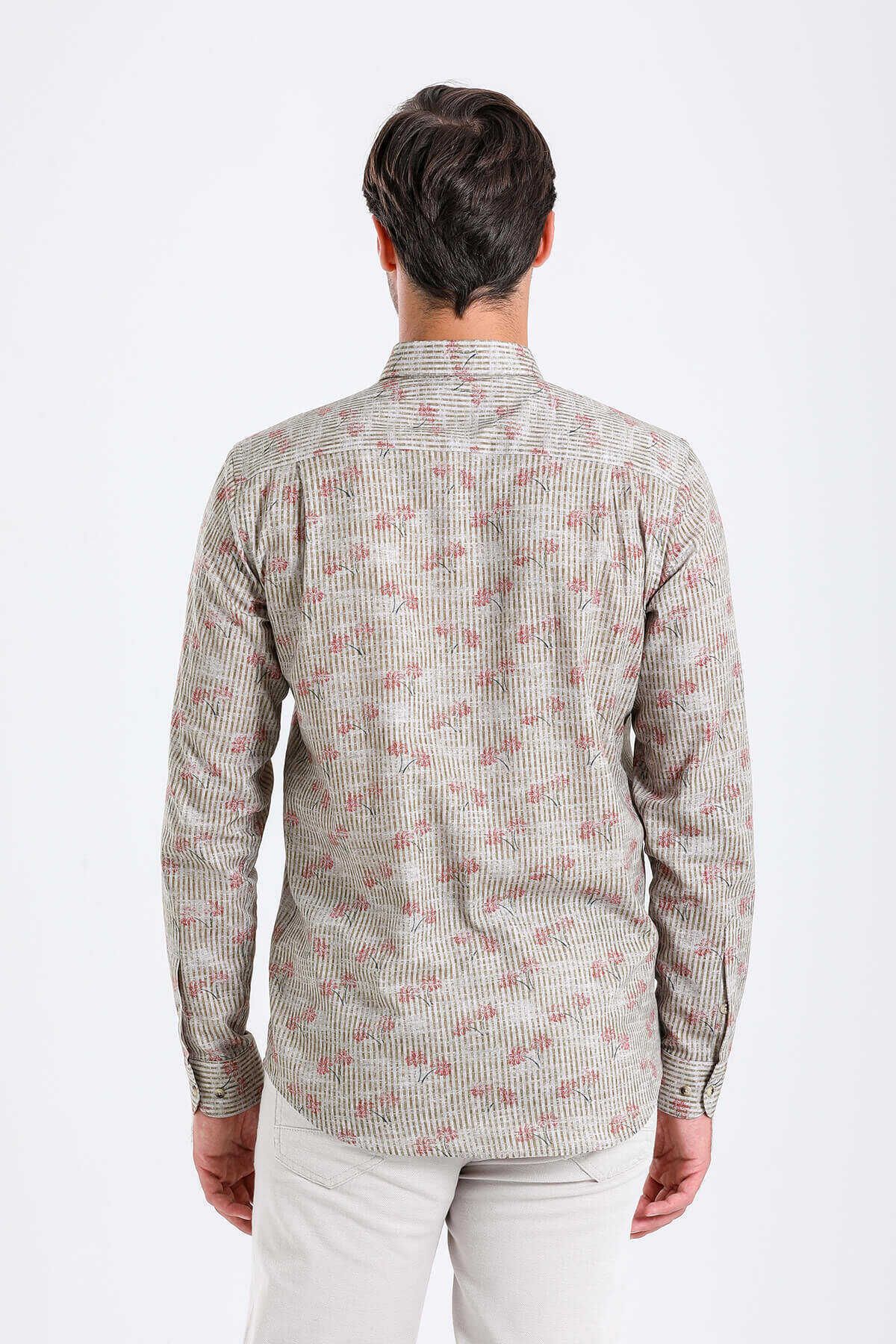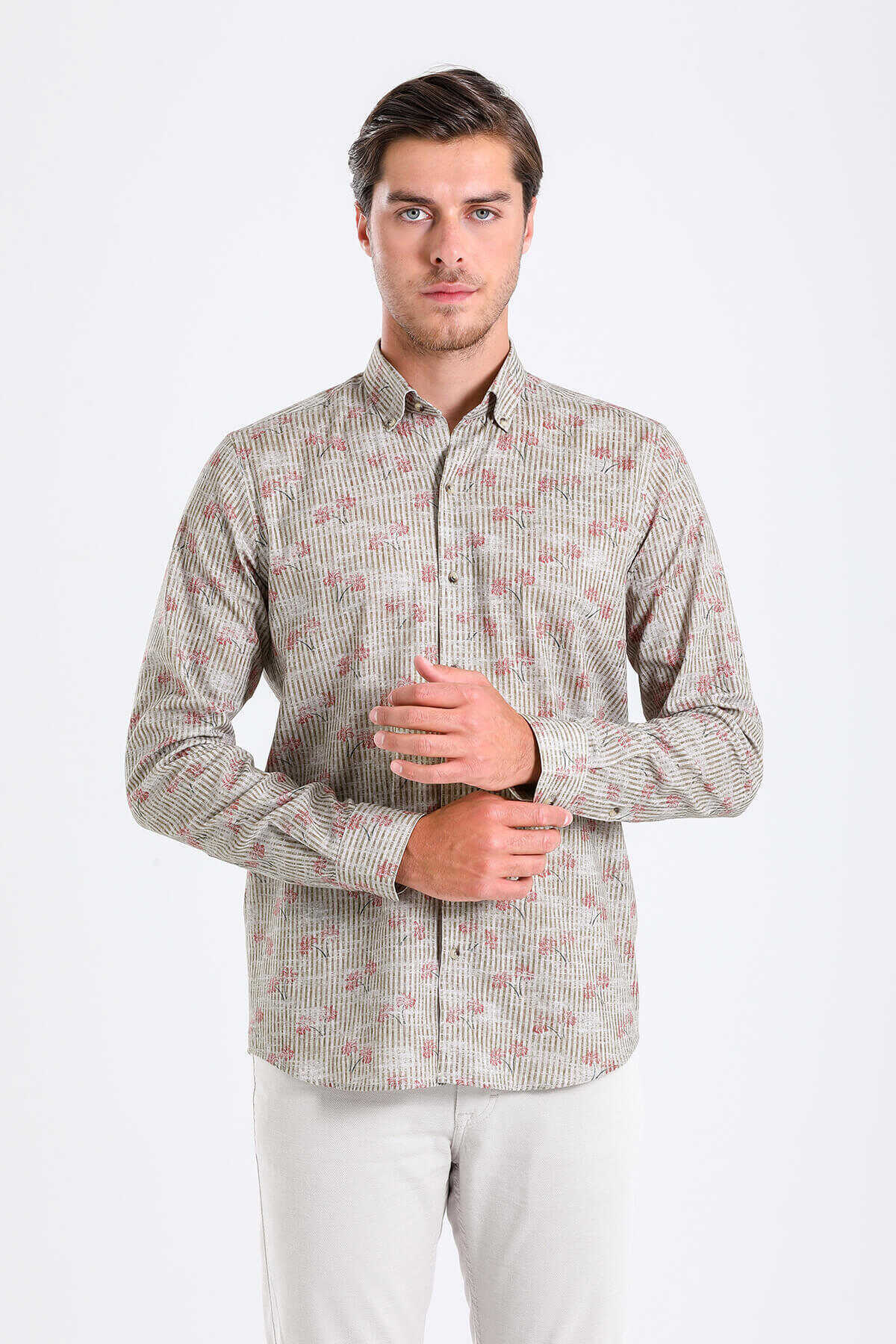 Haki Comfort Fit Baskılı 100% Pamuk Düğmeli Yaka Uzun Kollu Casual Gömlek