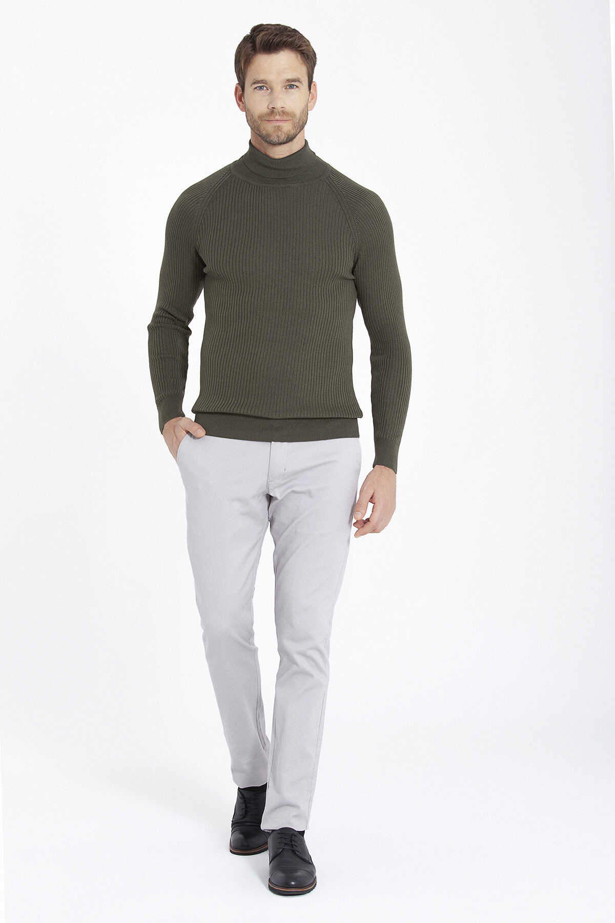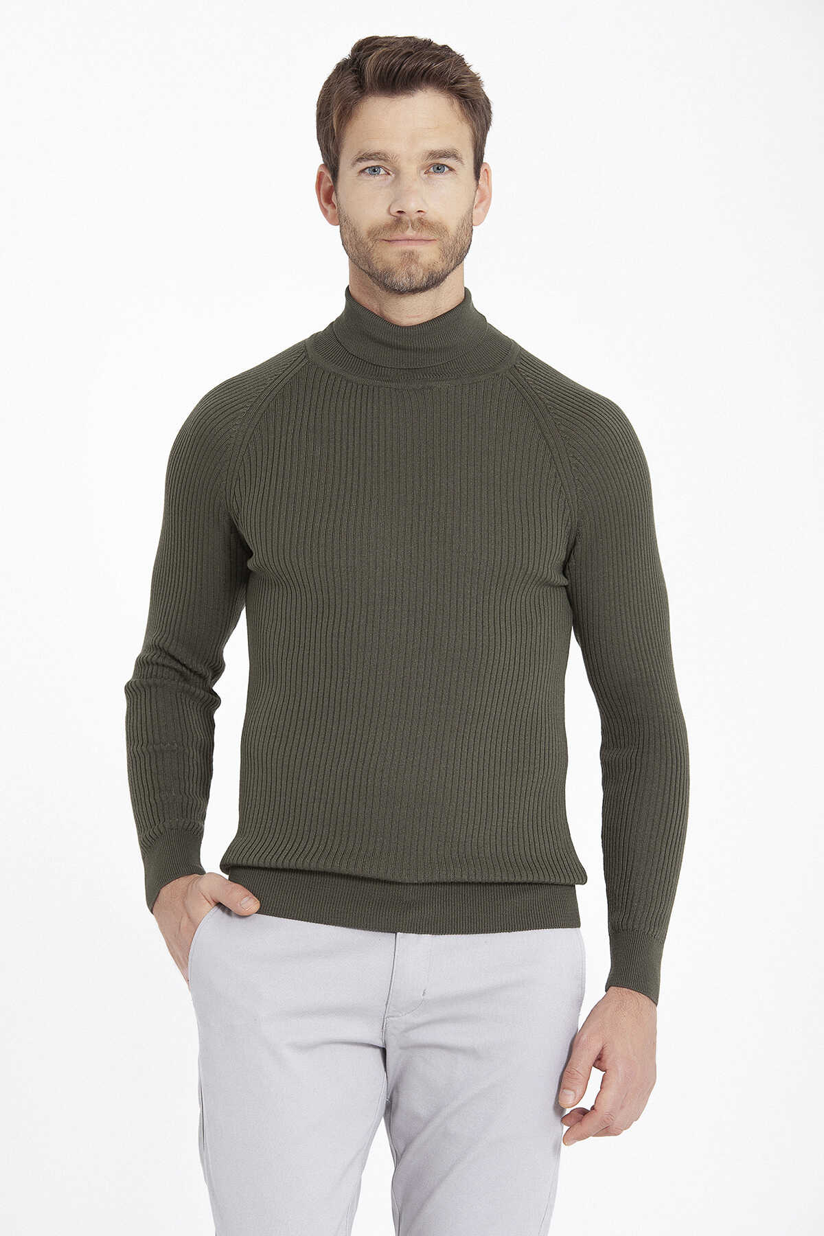 Haki Slim Fit Desenli Balıkçı Yaka Triko Kazak