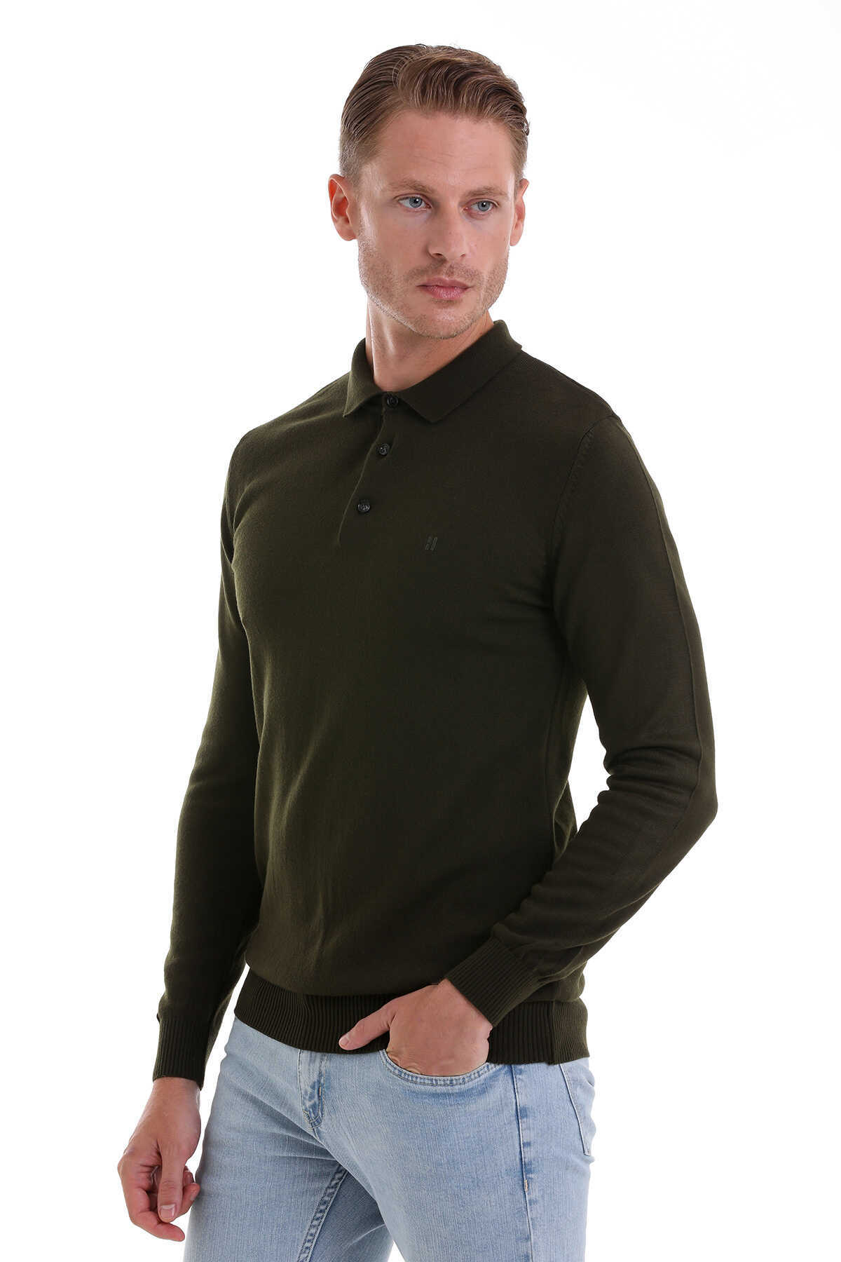Haki Regular Fit Düz Polo Yaka Triko Kazak