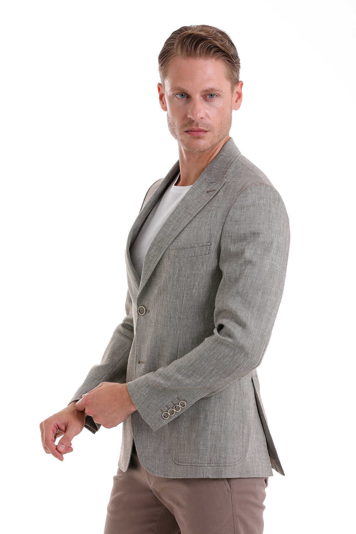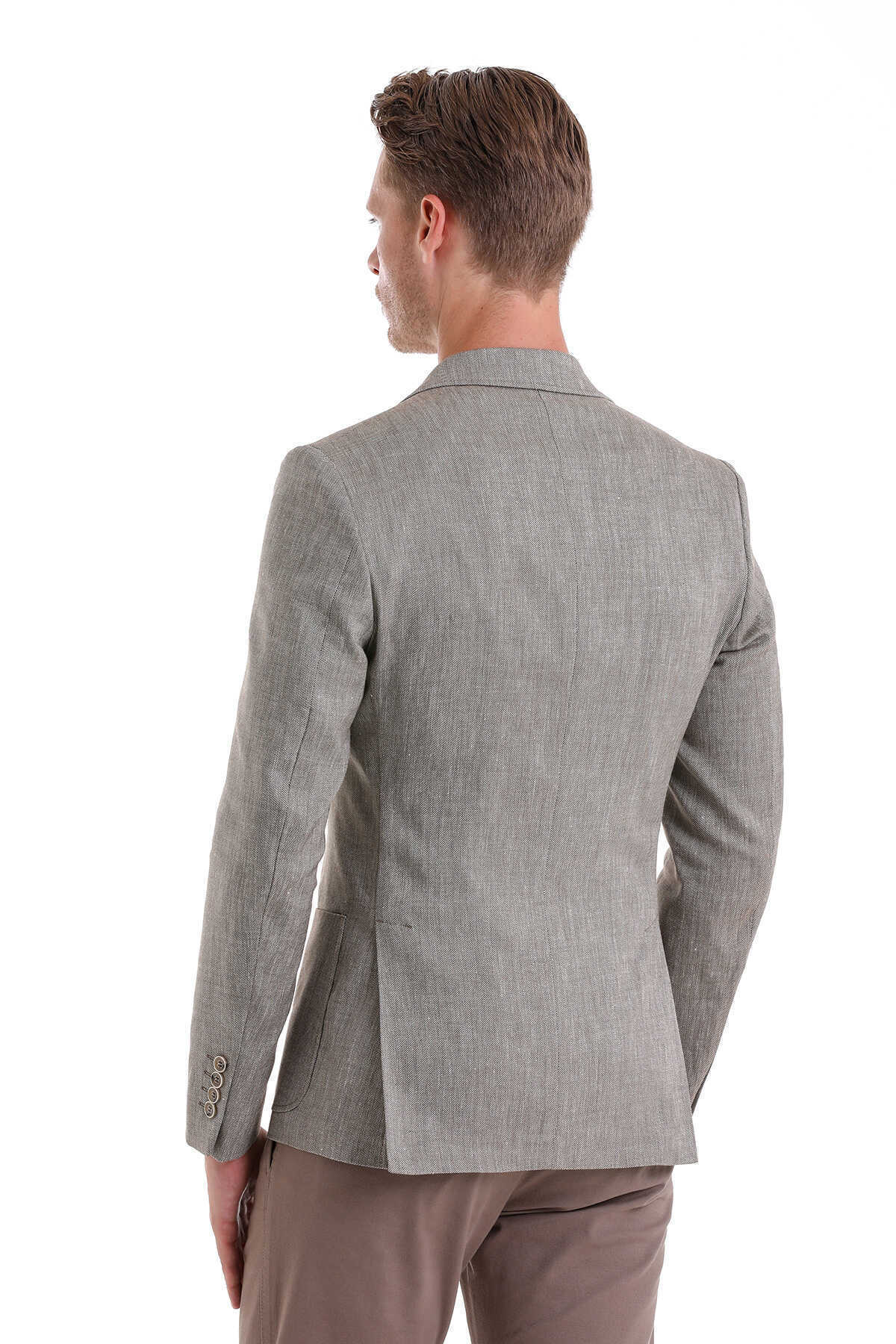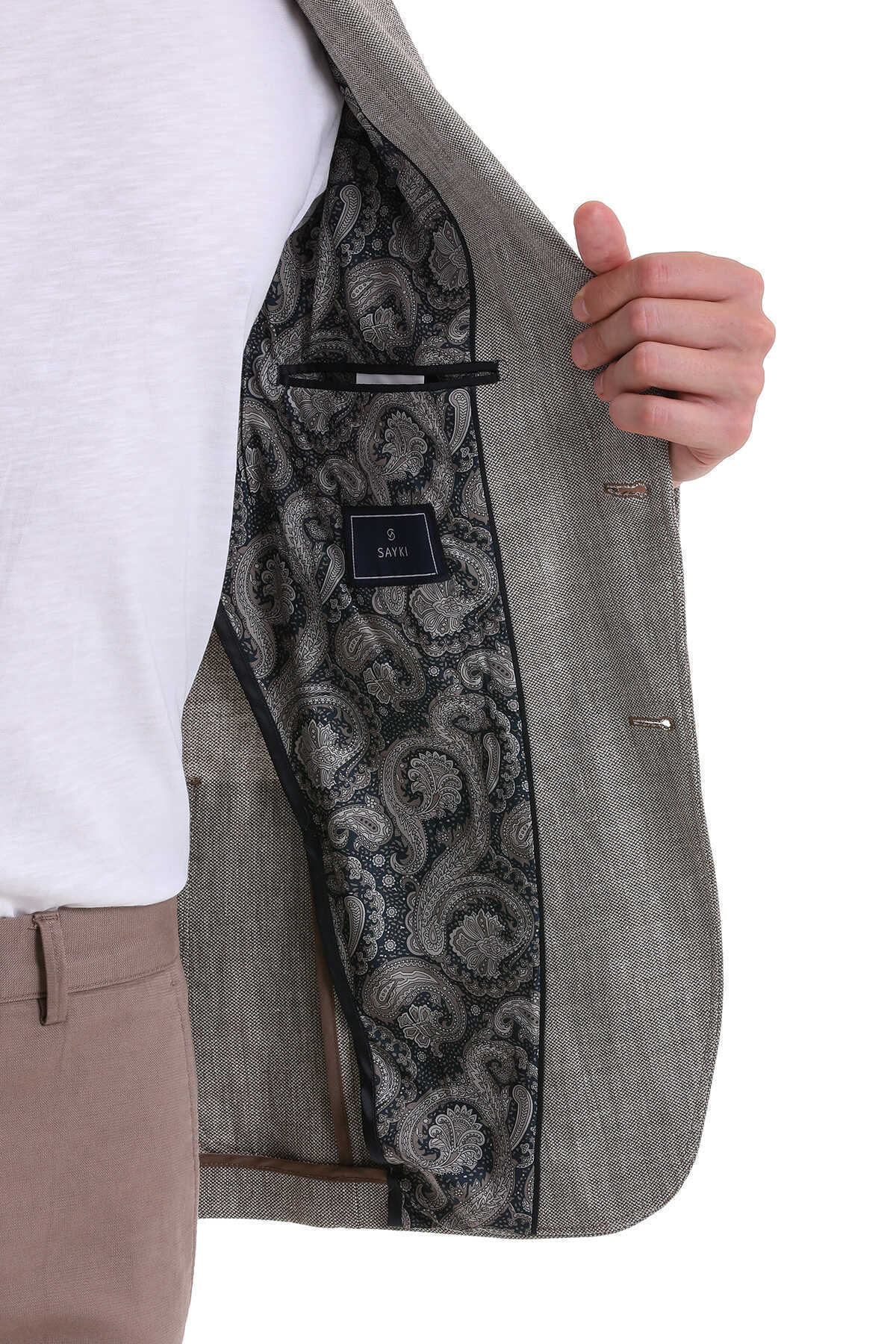 Kahverengi Comfort Fit Desenli Sivri Yaka Casual Keten Ceket