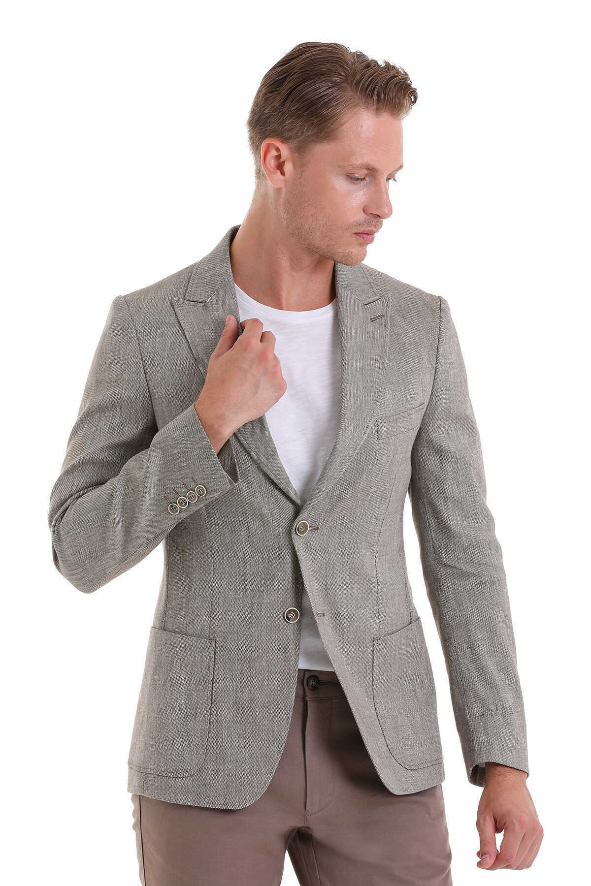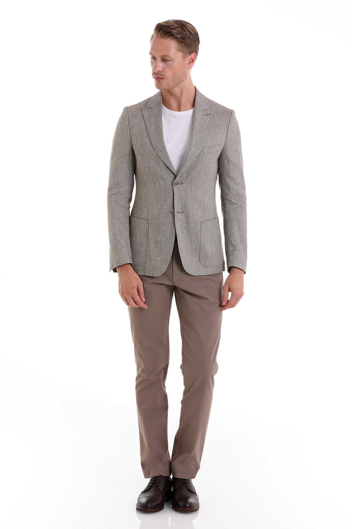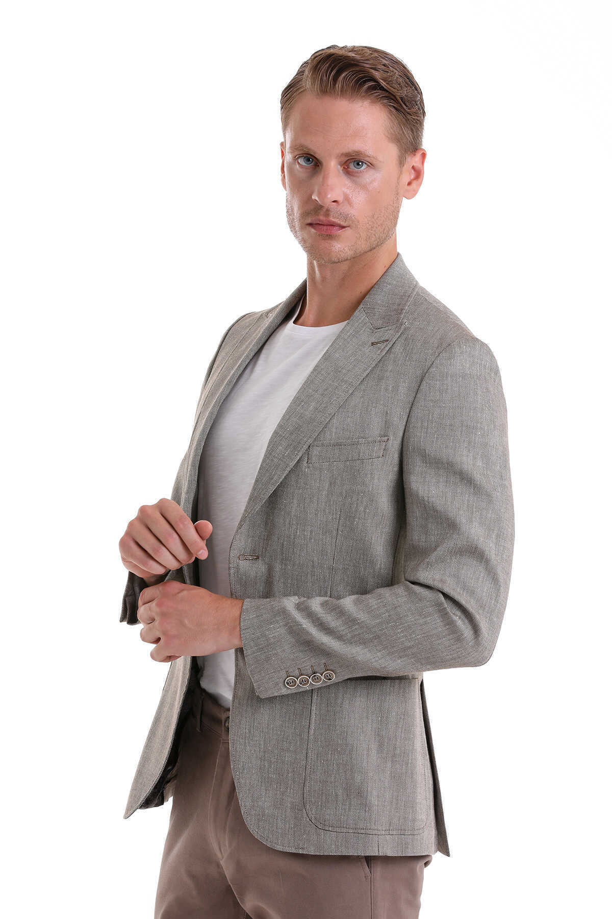 Kahverengi Comfort Fit Desenli Sivri Yaka Casual Keten Ceket