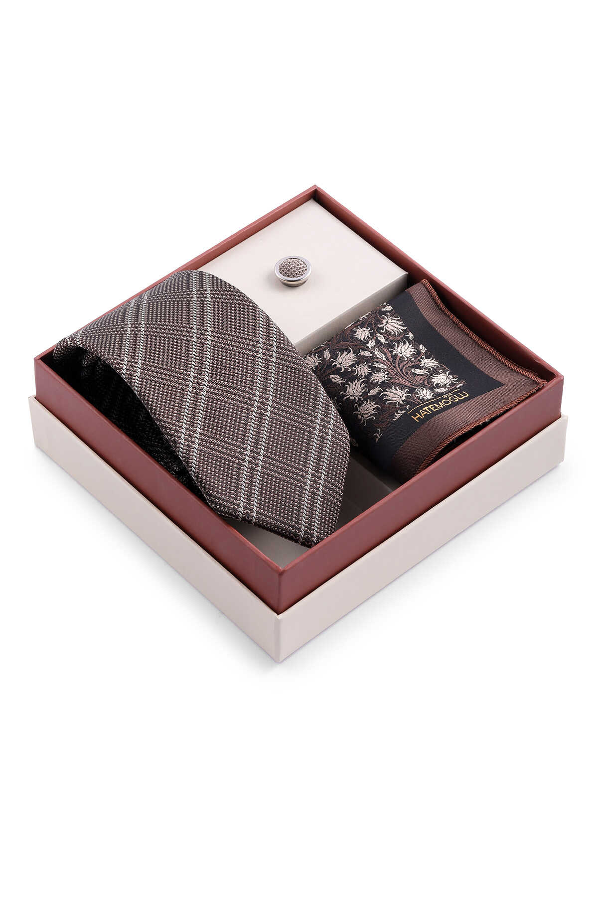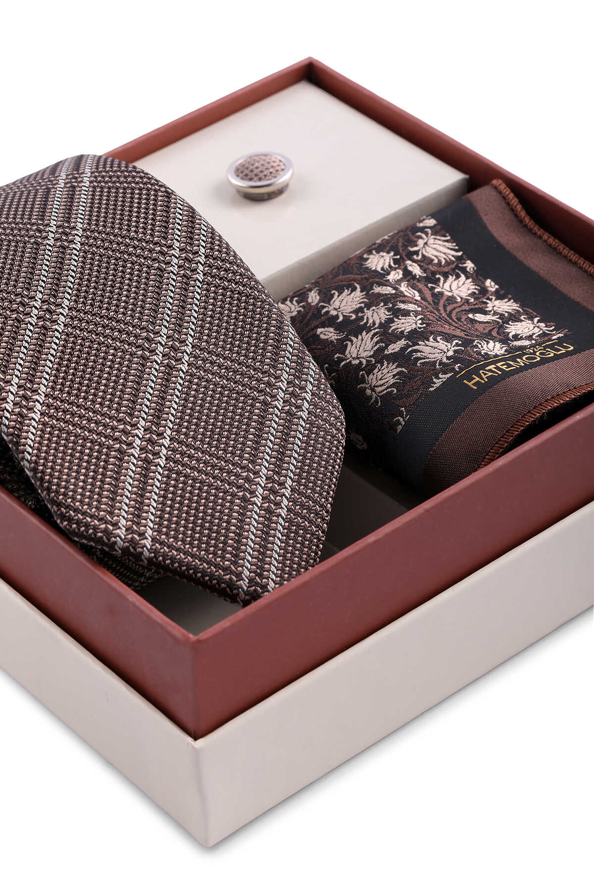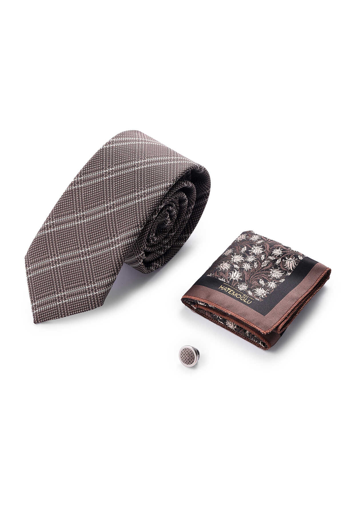 Kahverengi Üçlü Yaka Rozeti Kravat Mendil Set