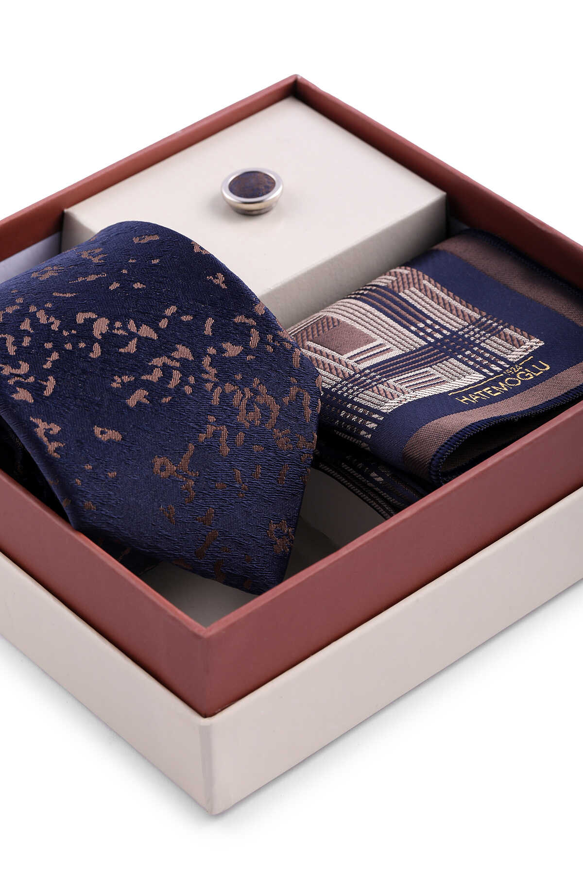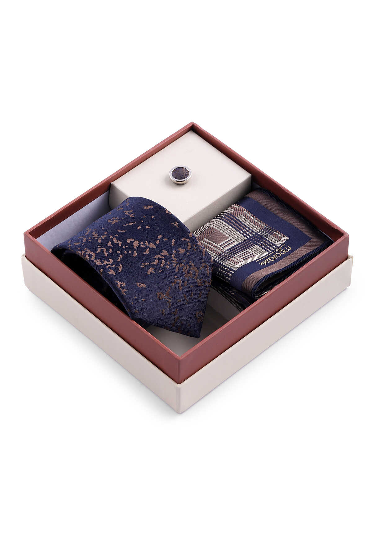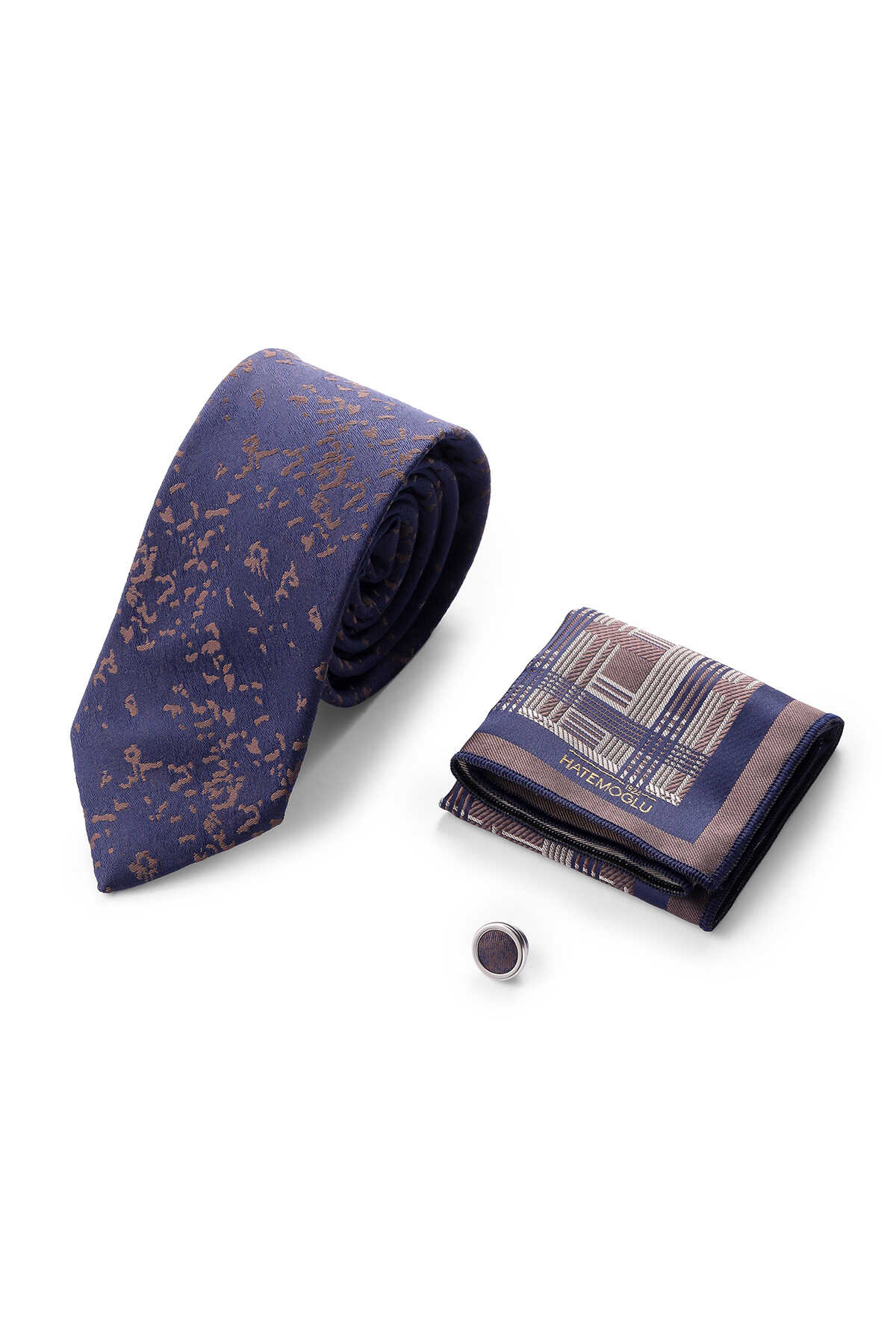 Kahverengi Üçlü Yaka Rozeti Kravat Mendil Set