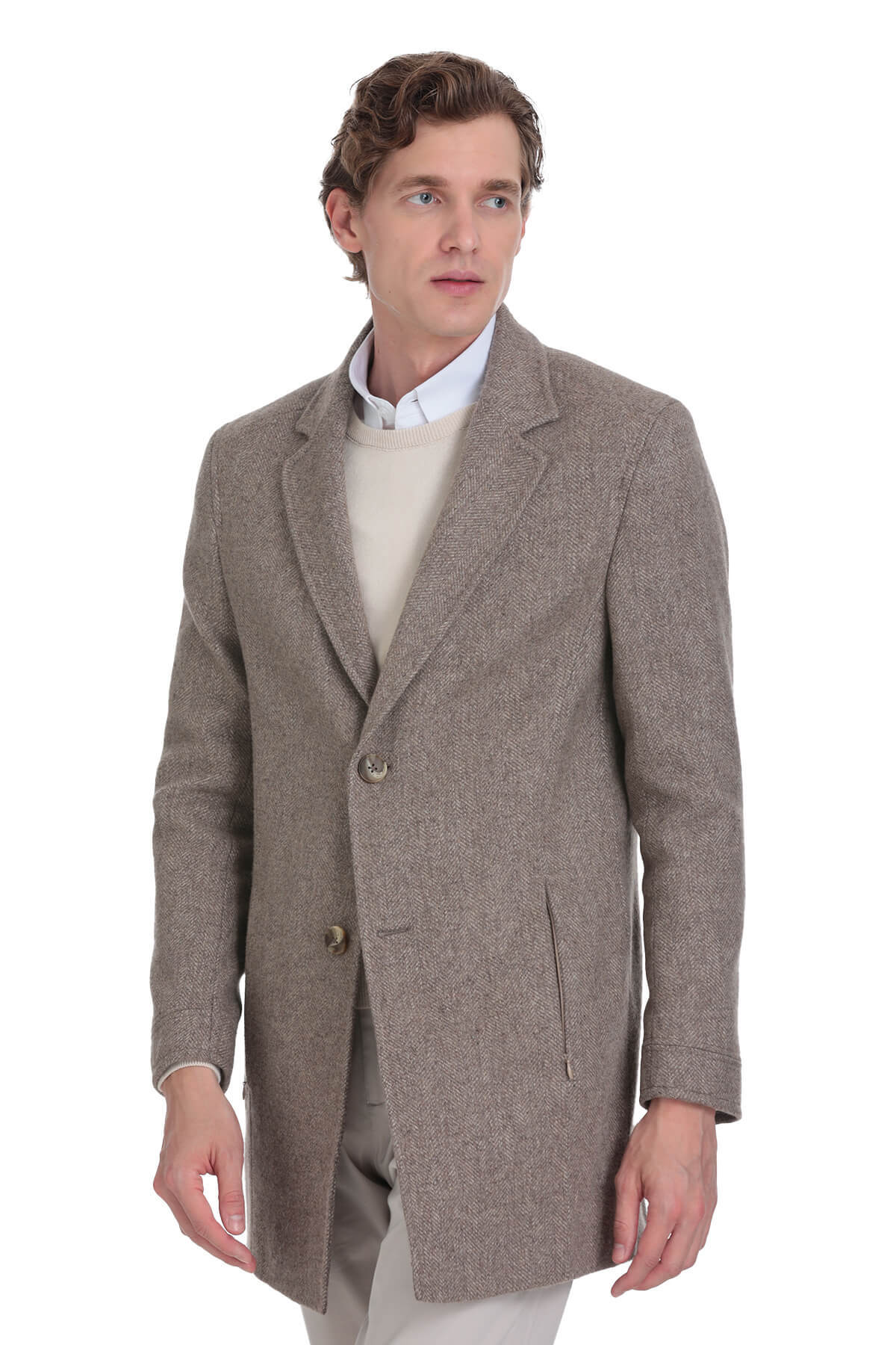 Kahverengi Slim Fit Ceket Yaka Yünlü Kaşe Palto