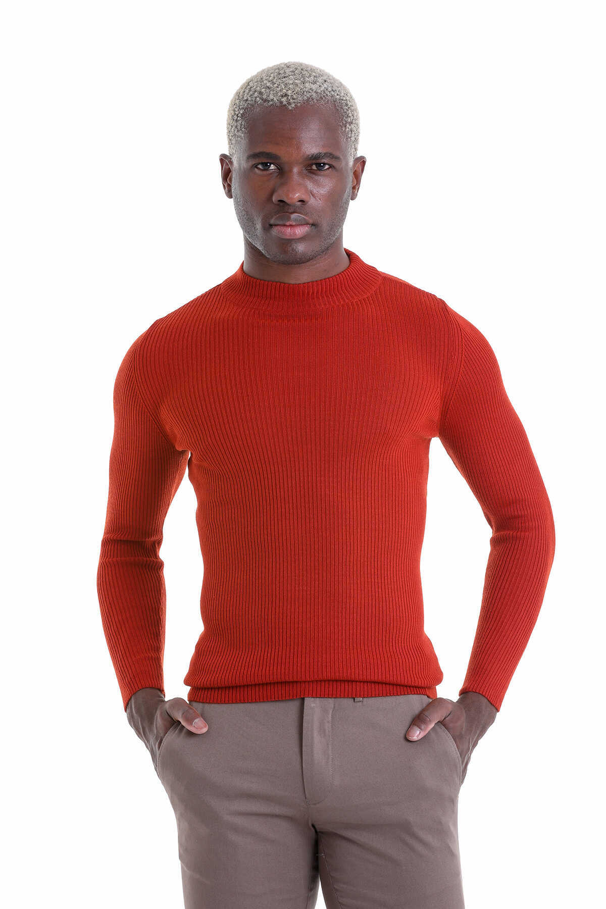 Turuncu Slim Fit Fitilli Yarım Balıkçı Yaka Yünlü Kazak