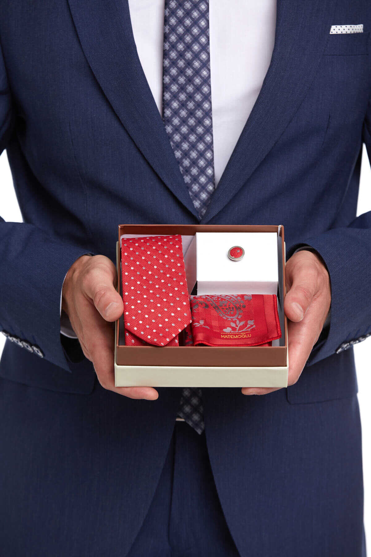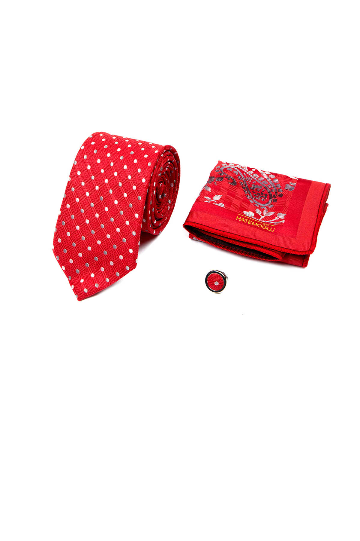 Kırmızı Üçlü Yaka Rozeti Kravat Mendil Set