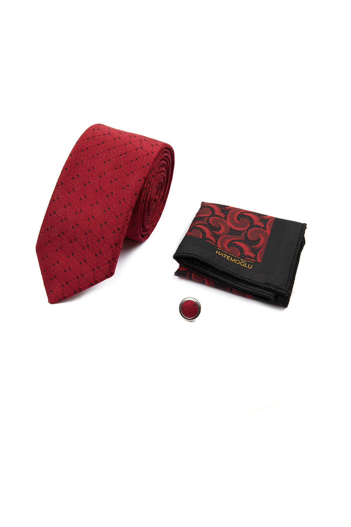 Kırmızı Üçlü Yaka Rozeti Kravat Mendil Set