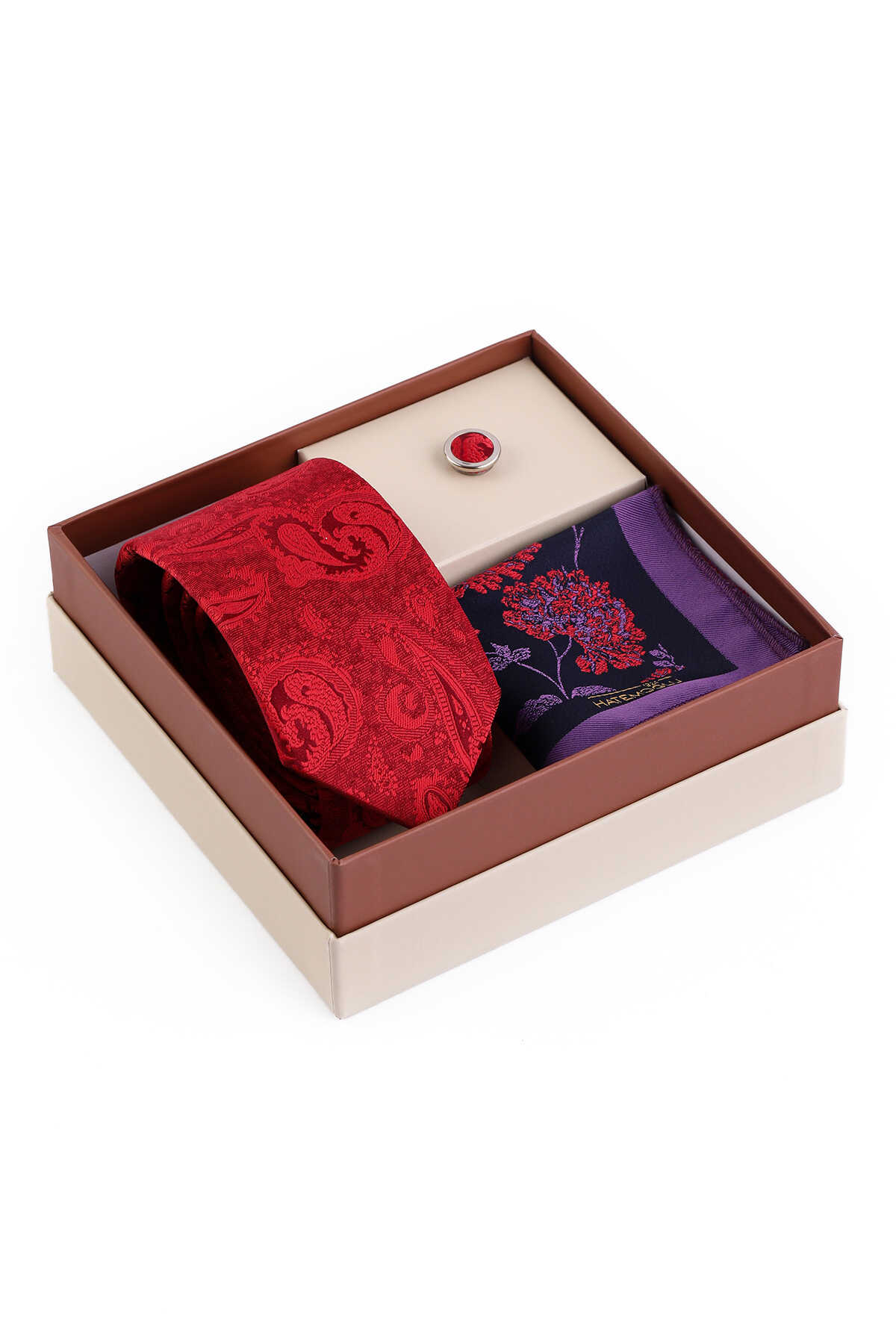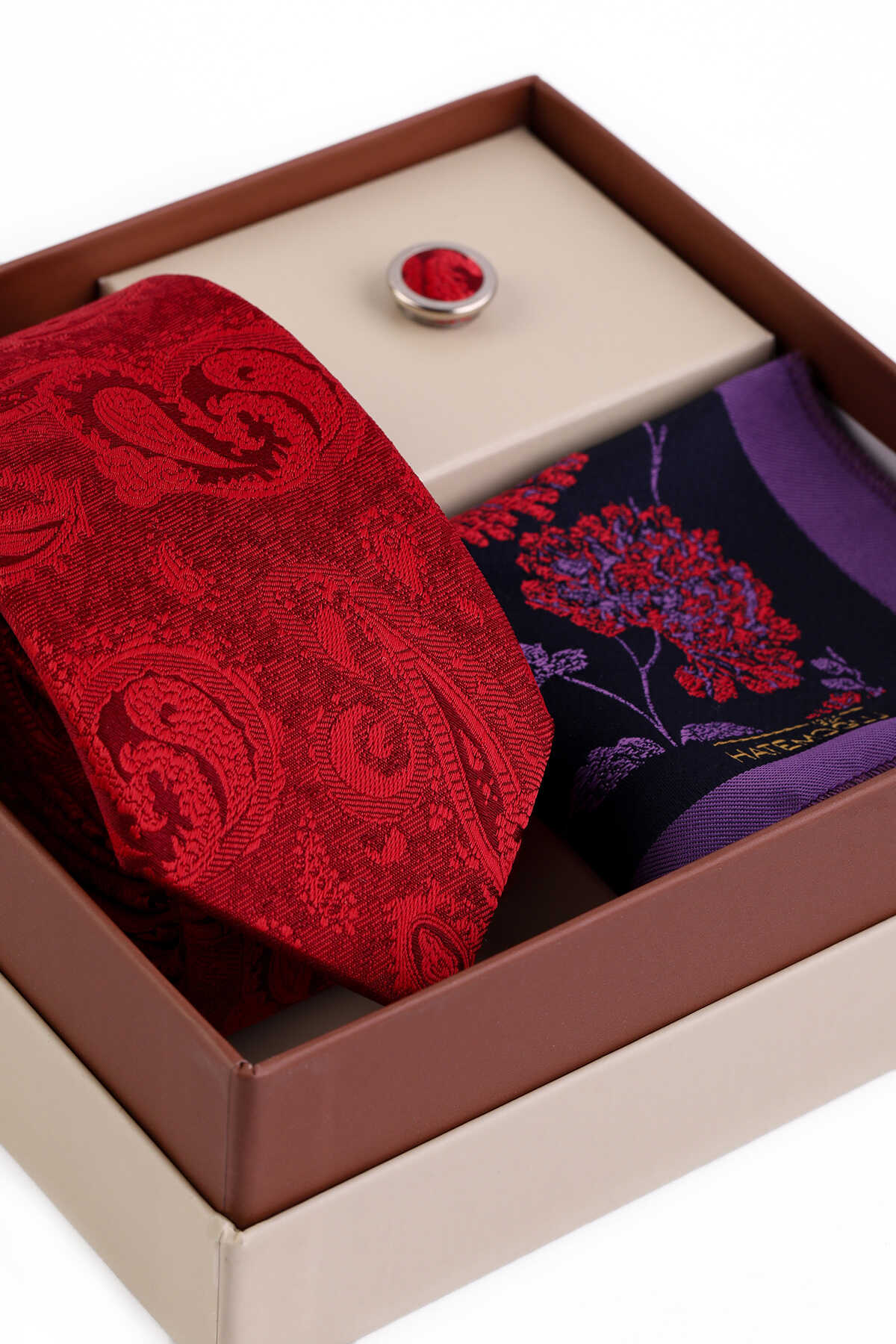 Kırmızı Üçlü Yaka Rozeti Kravat Mendil Set
