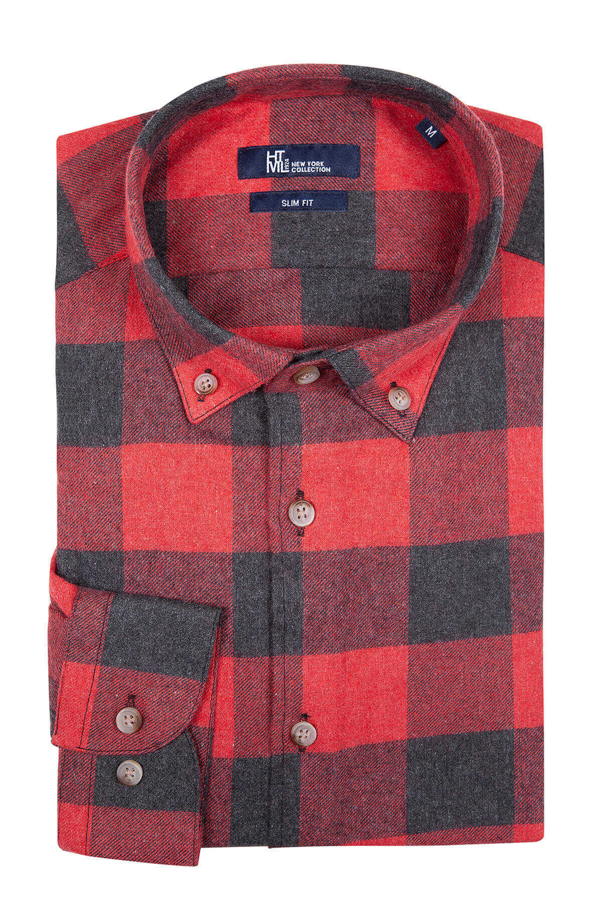 Kırmızı Slim Fit Kareli Pamuklu Uzun Kol Gömlek