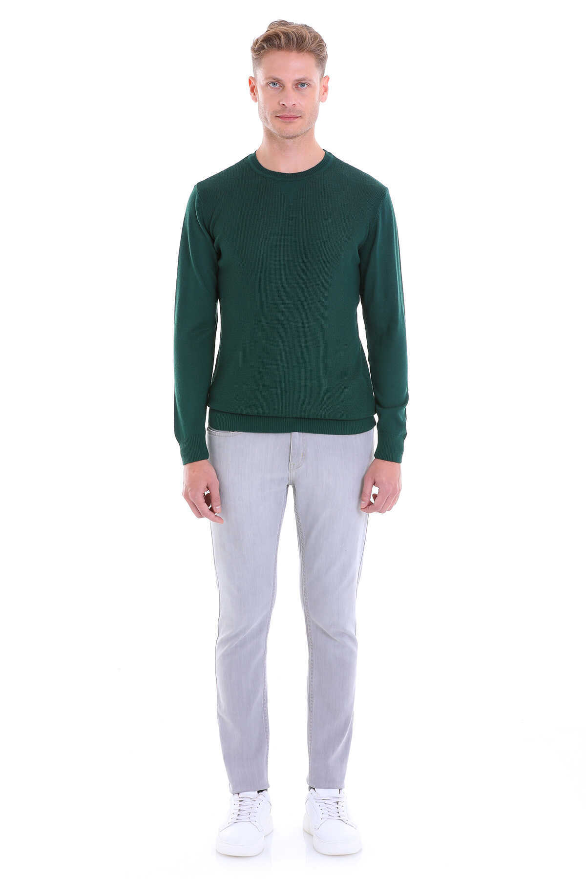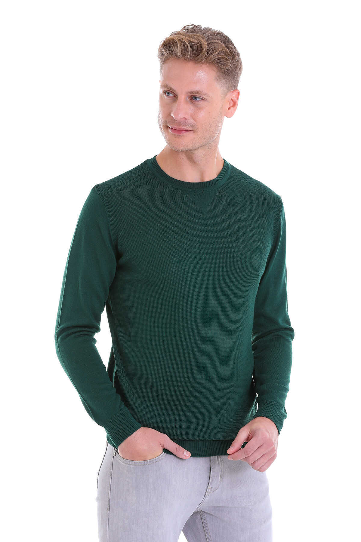 Yeşil Comfort Fit Pirinç Örgü Desenli Bisiklet Yaka Yünlü Kazak