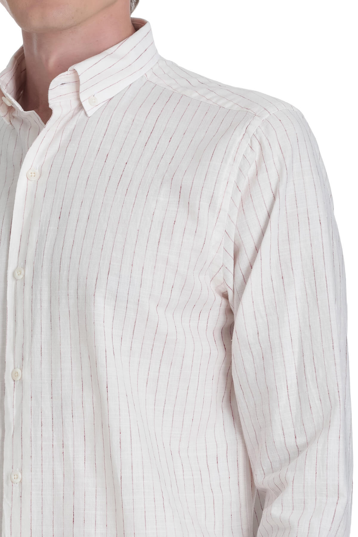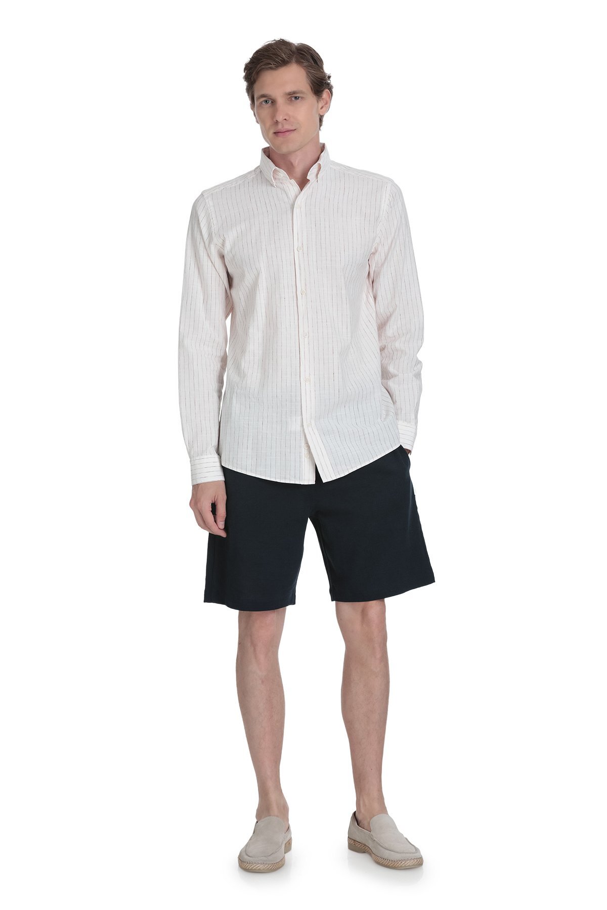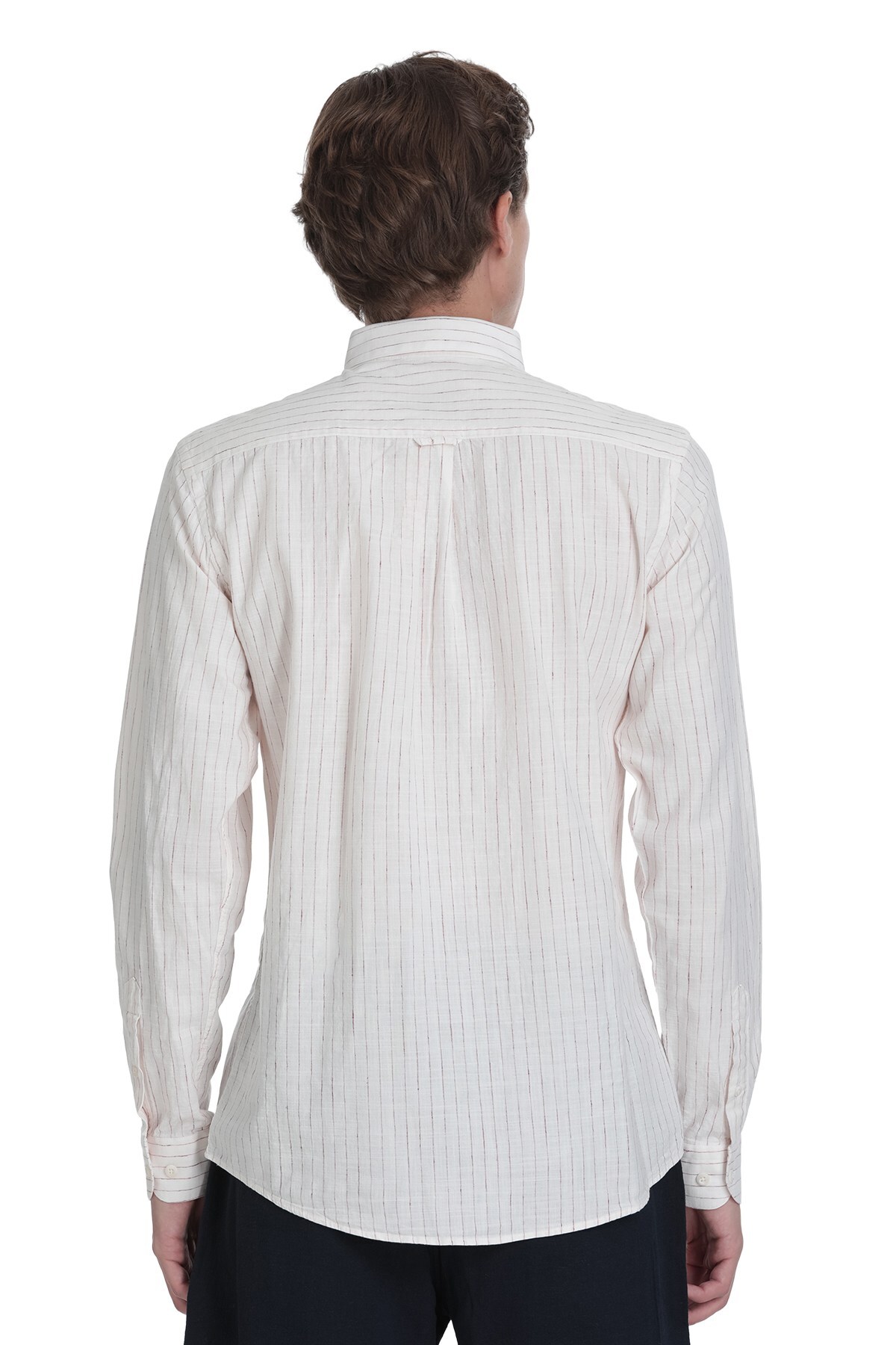 Krem Comfort Fit Çizgili Düğmeli Yaka Pamuk-Keten Uzun Kollu Gömlek - 6