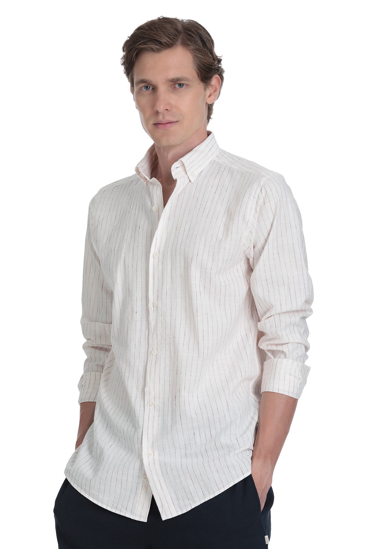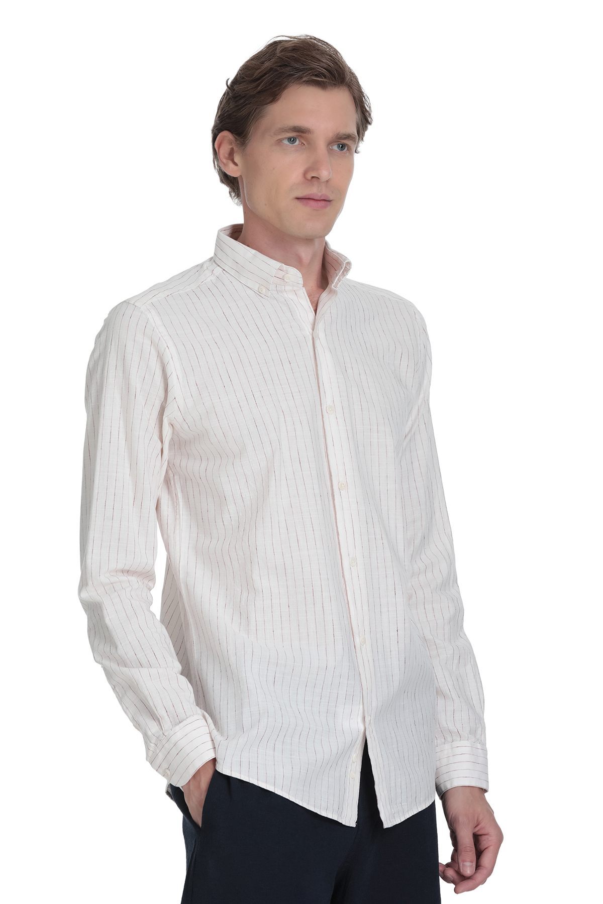 Krem Comfort Fit Çizgili Düğmeli Yaka Pamuk-Keten Uzun Kollu Gömlek