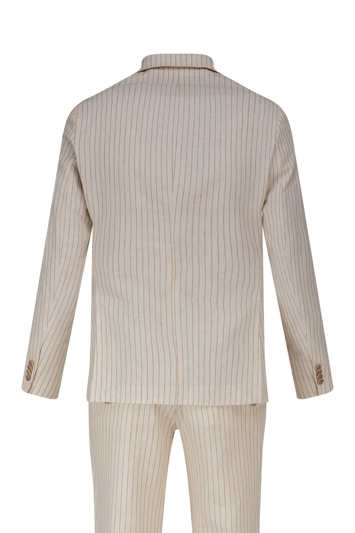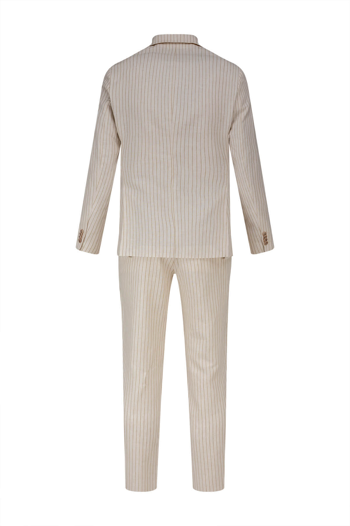 Krem Regular Fit Çizgili Kruvaze Keten Takım Elbise