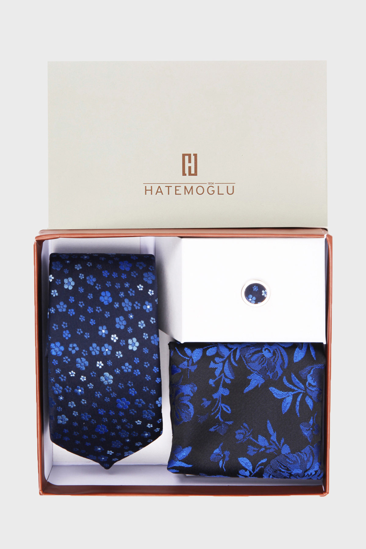 Lacivert Üçlü Kravat Mendil Yaka Rozeti Set