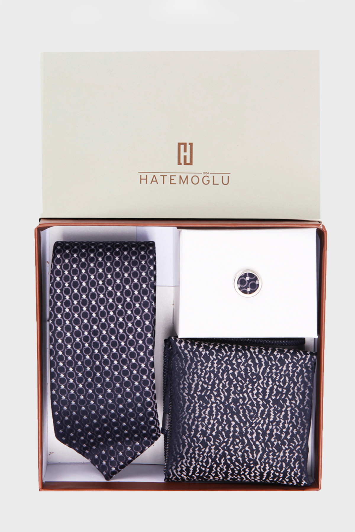 Lacivert Üçlü Kravat Mendil Yaka Rozeti Set