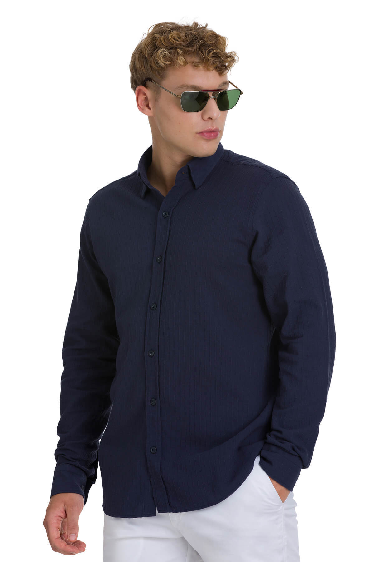 Lacivert Comfort Fit 100% Pamuk Gizli Düğmeli Yaka Uzun Kollu Pamuklu Gömlek