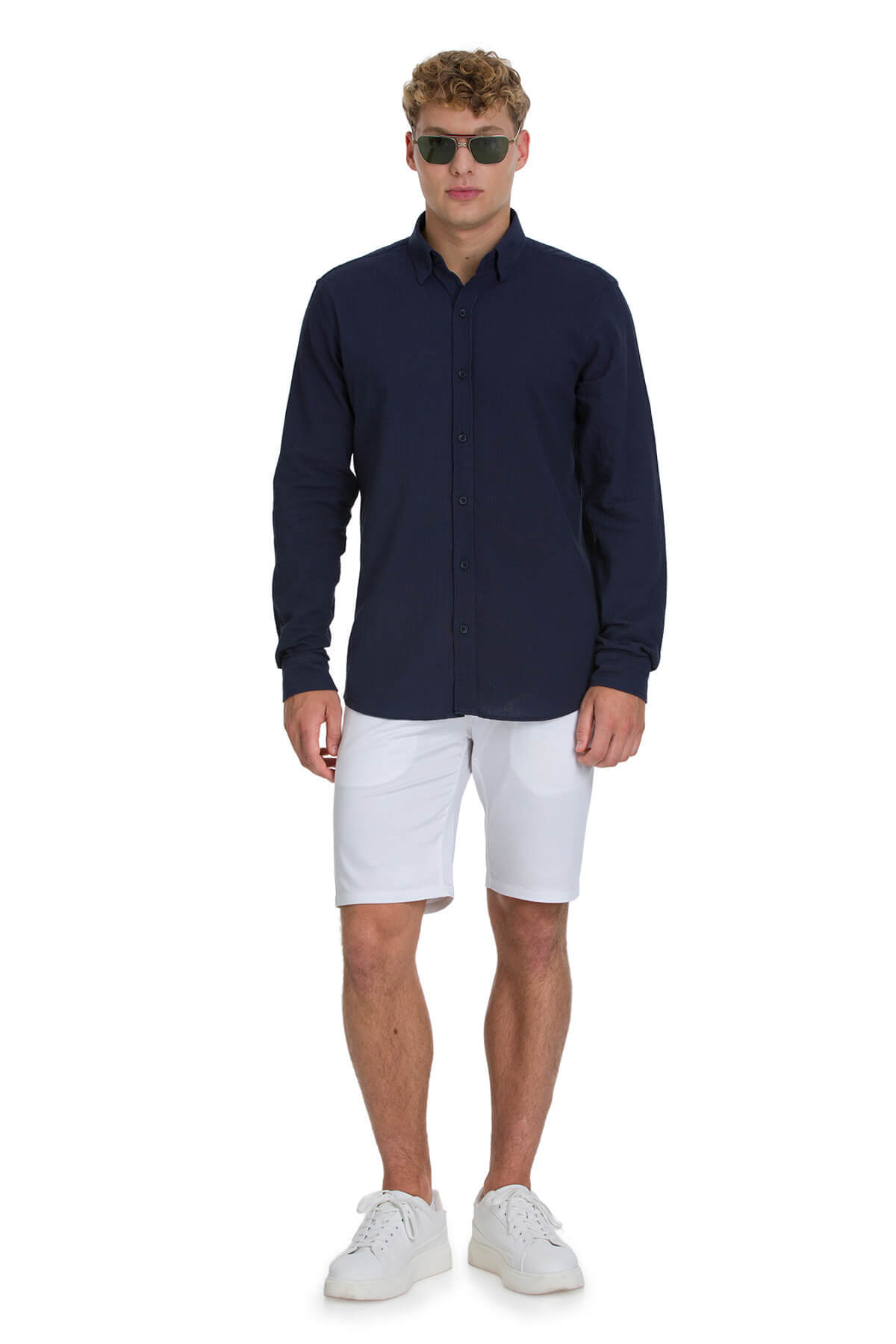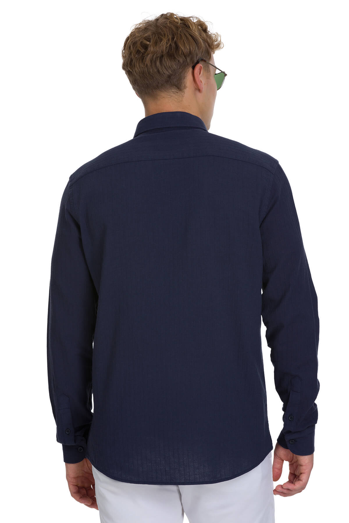 Lacivert Comfort Fit 100% Pamuk Gizli Düğmeli Yaka Uzun Kollu Pamuklu Gömlek - 5