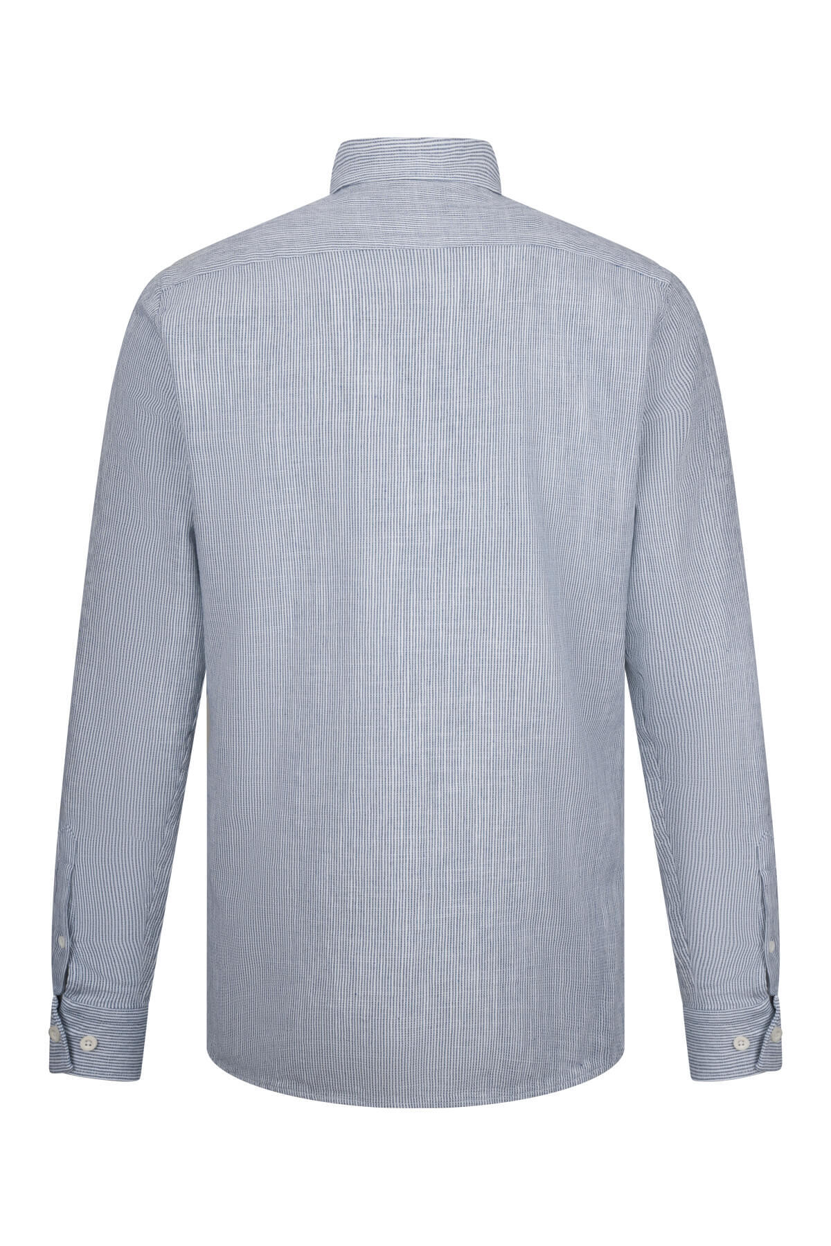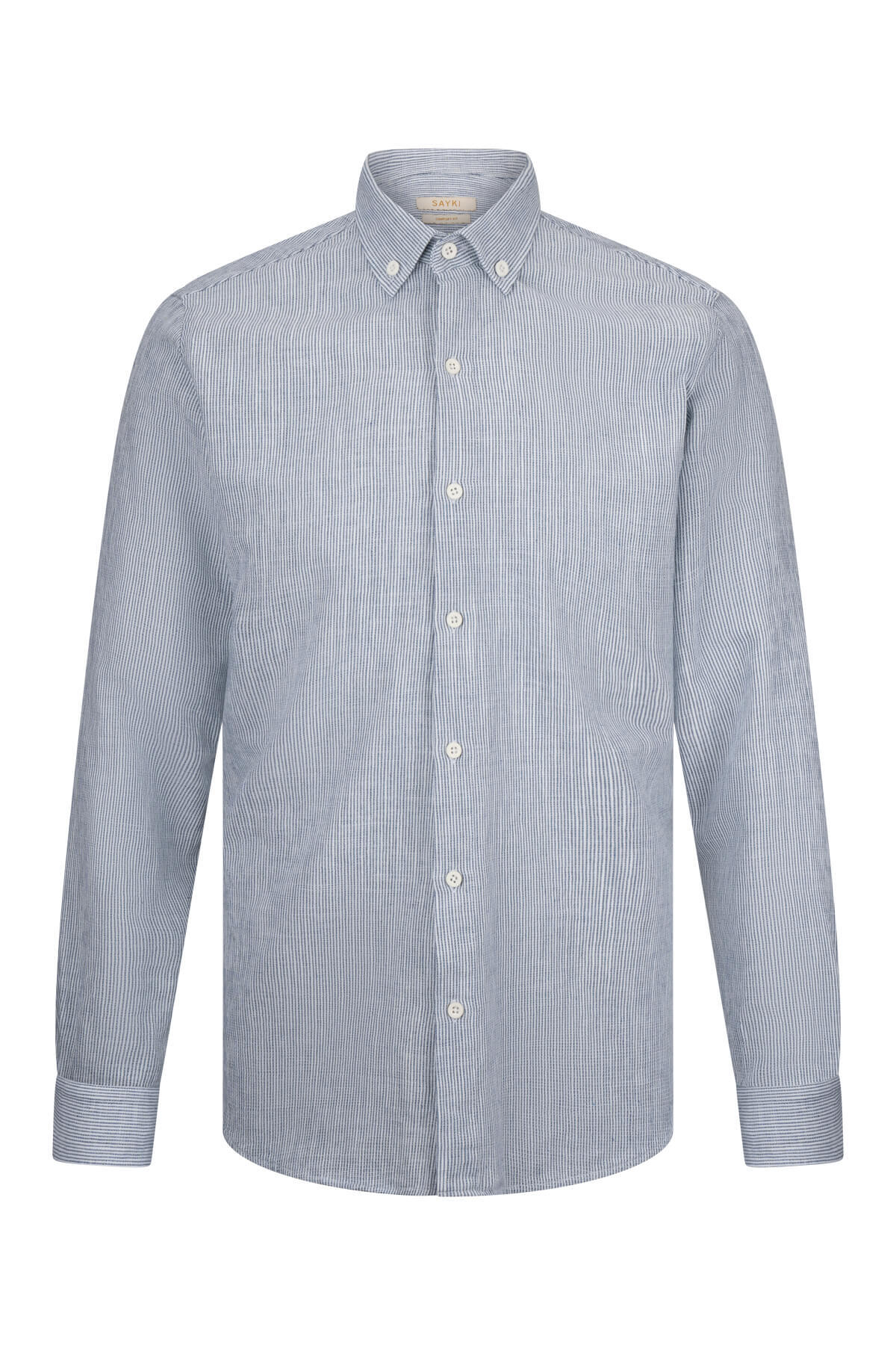 Lacivert Comfort Fit Çizgili Düğmeli Yaka Uzun Kollu Pamuklu Gömlek