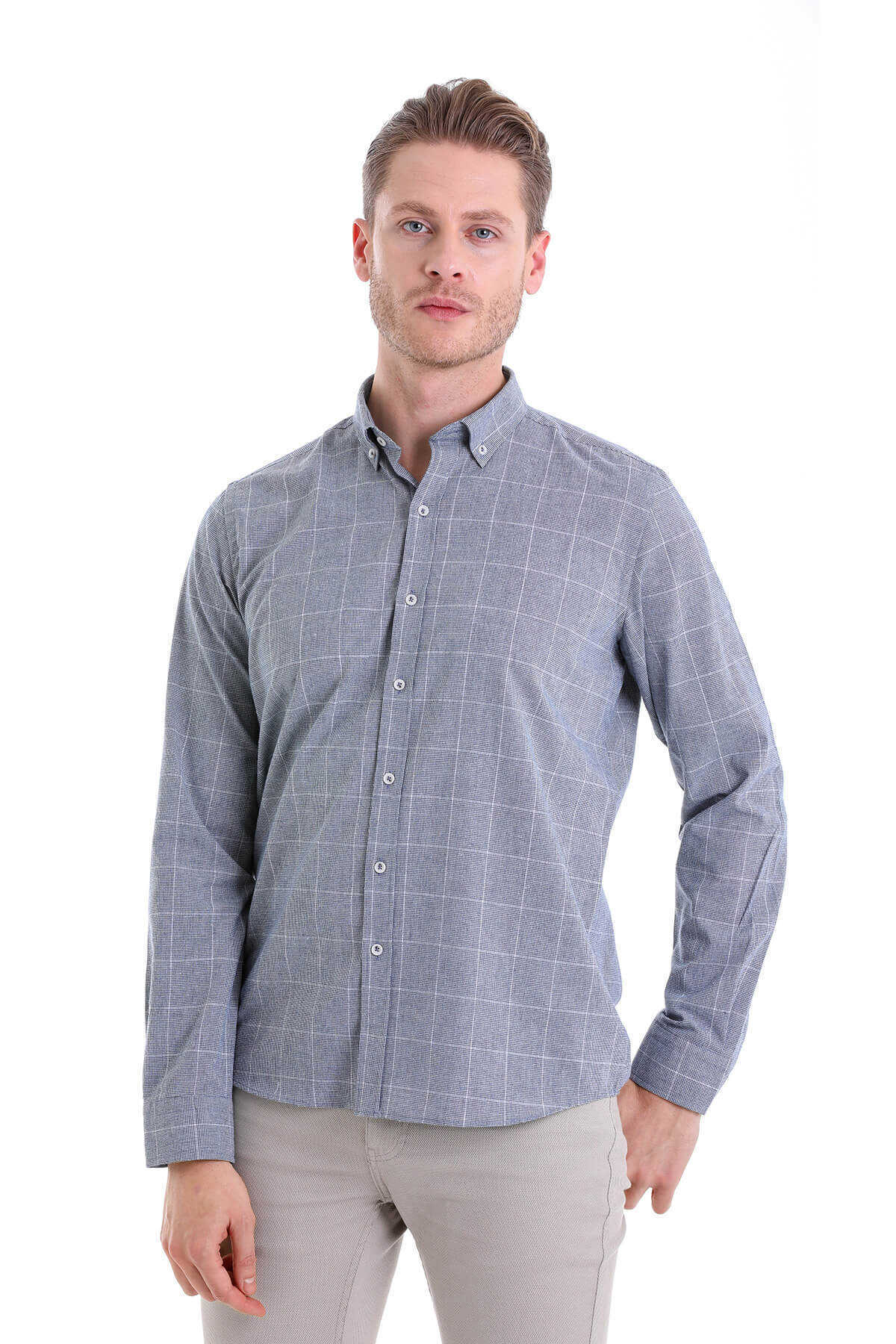 Lacivert Comfort Fit Desenli Düğmeli Yaka Uzun Kollu Casual Flanel Gömlek