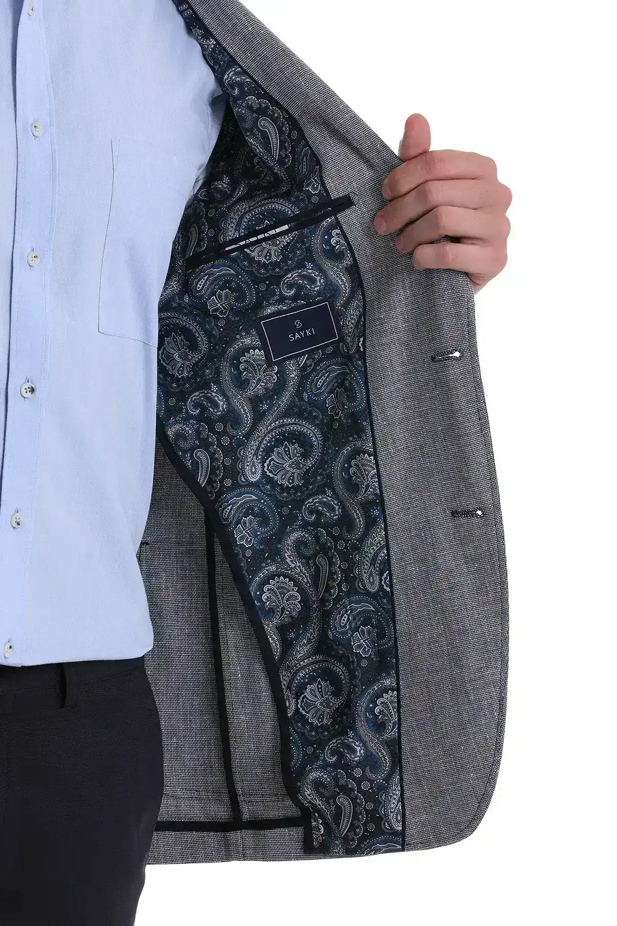 Gri Comfort Fit Desenli Sivri Yaka Casual Keten Ceket - 7
