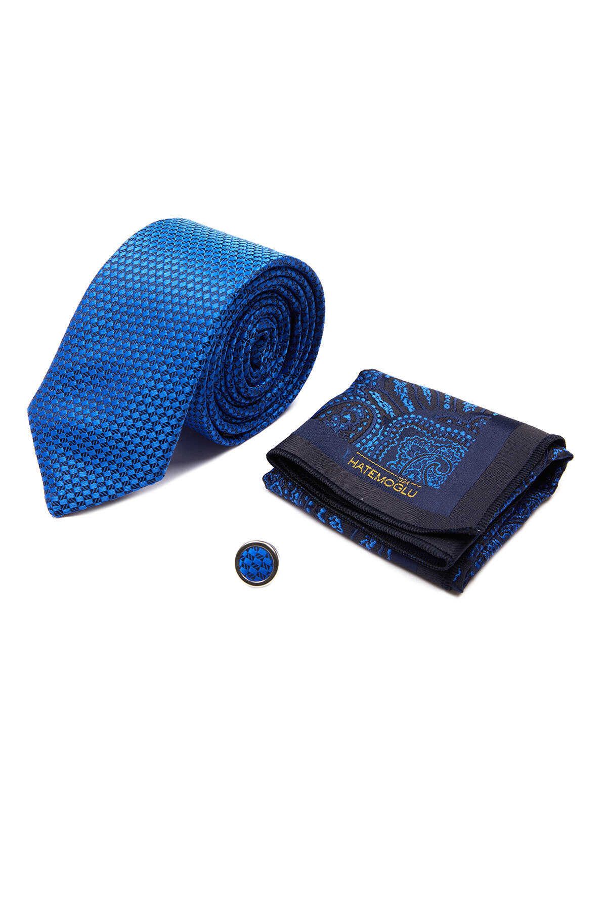 Lacivert Üçlü Yaka Rozeti Kravat Mendil Set