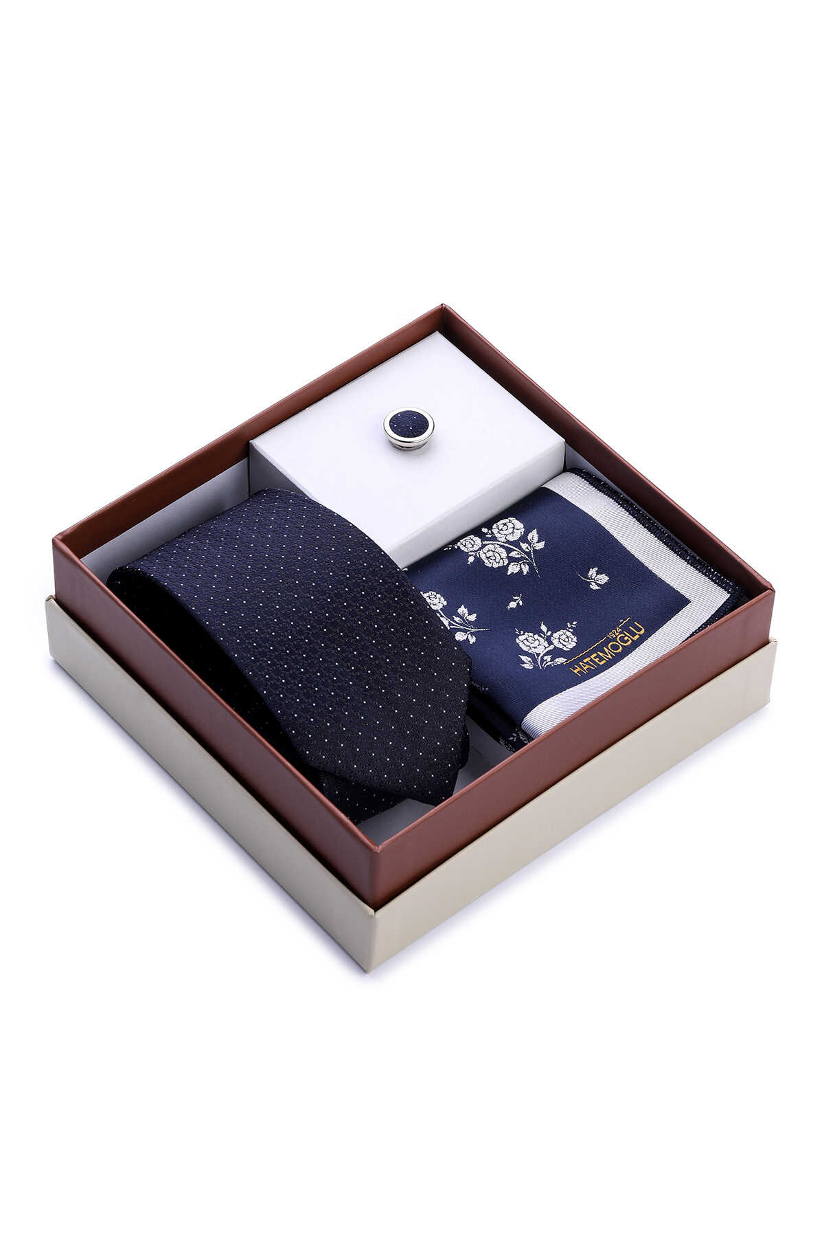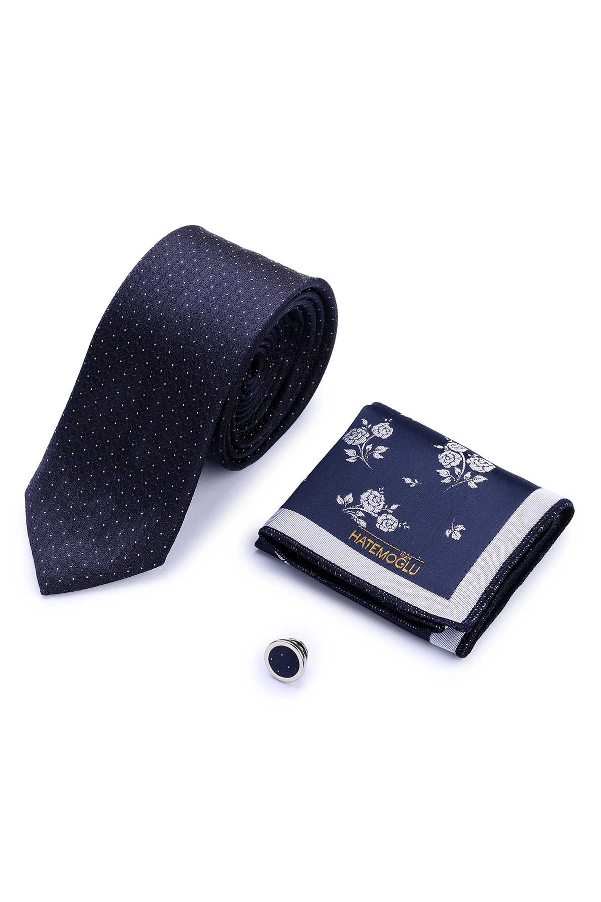 Lacivert Üçlü Yaka Rozeti Kravat Mendil Set