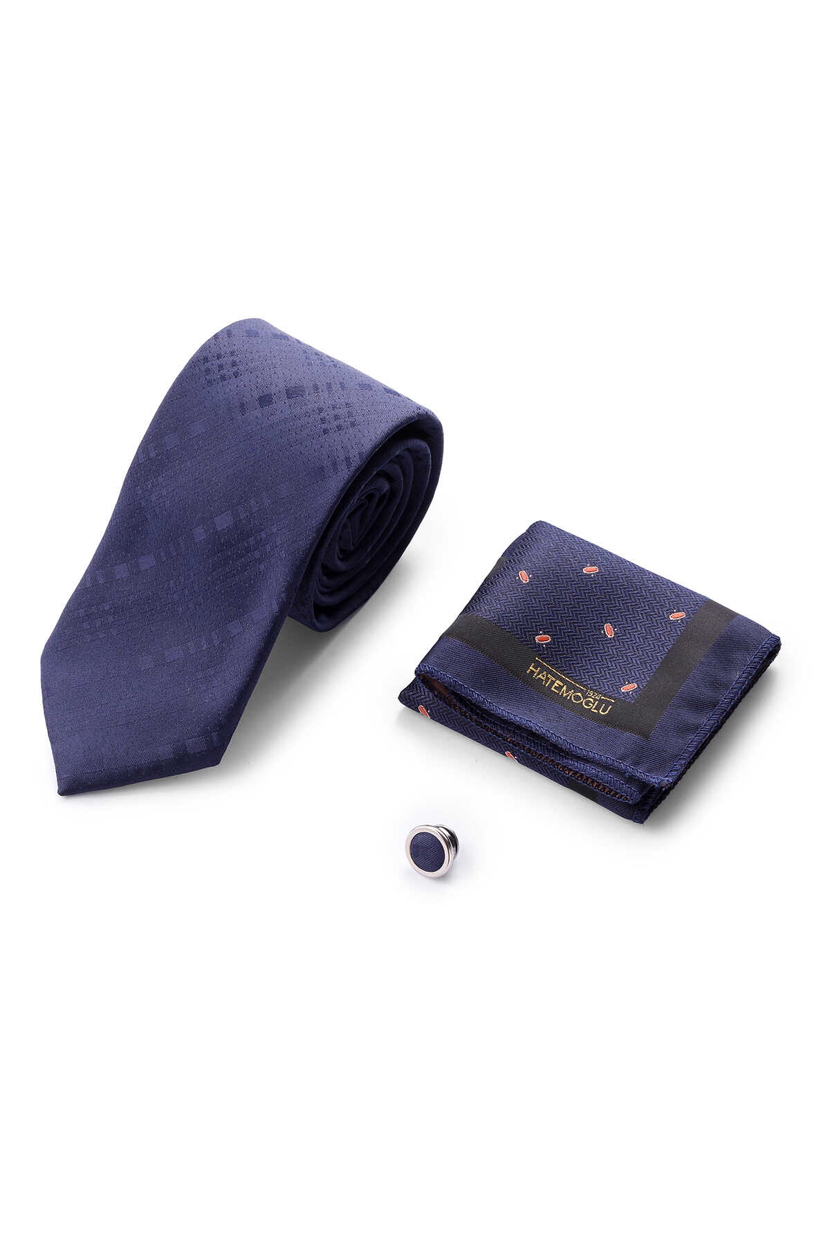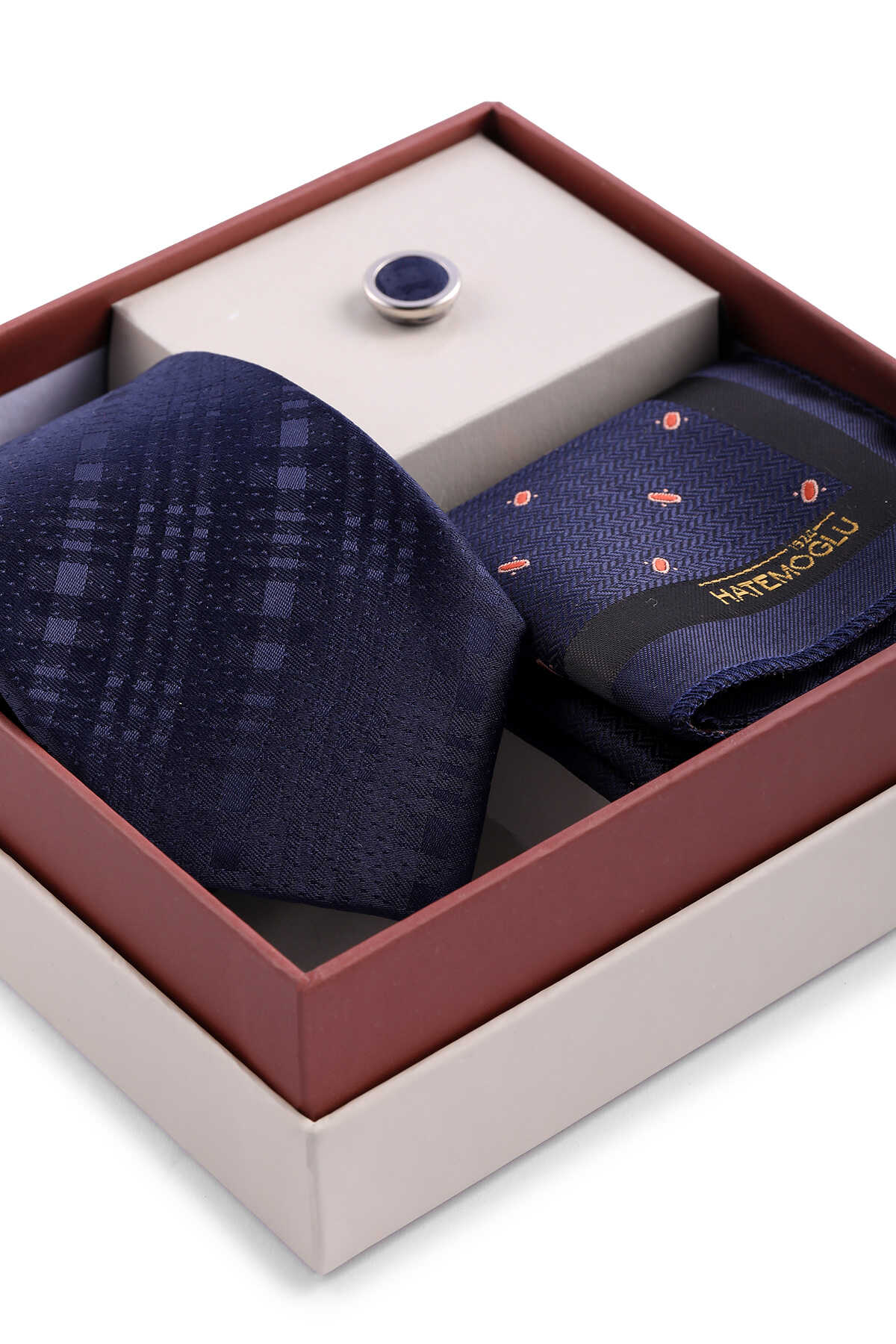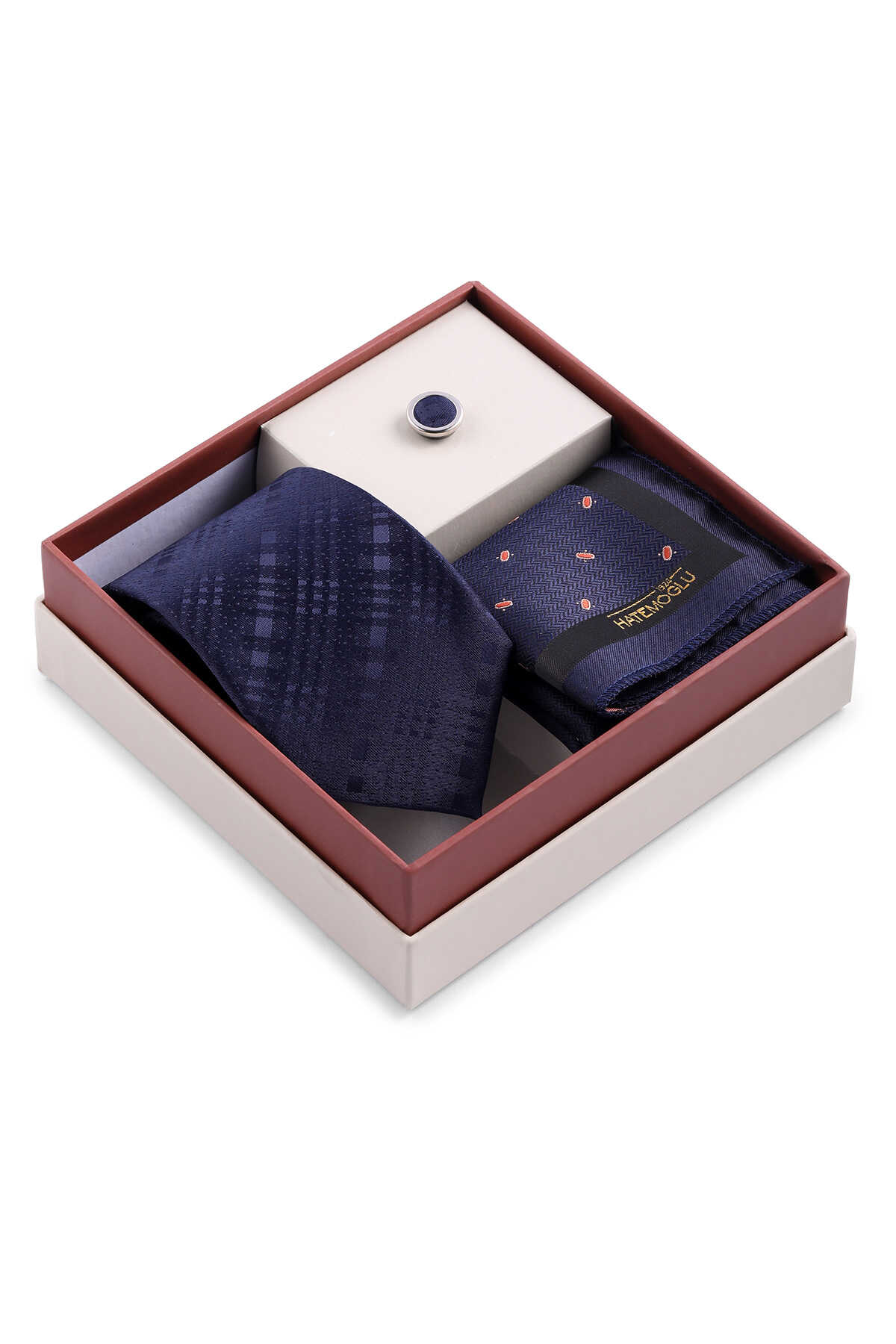Lacivert Üçlü Yaka Rozeti Kravat Mendil Set