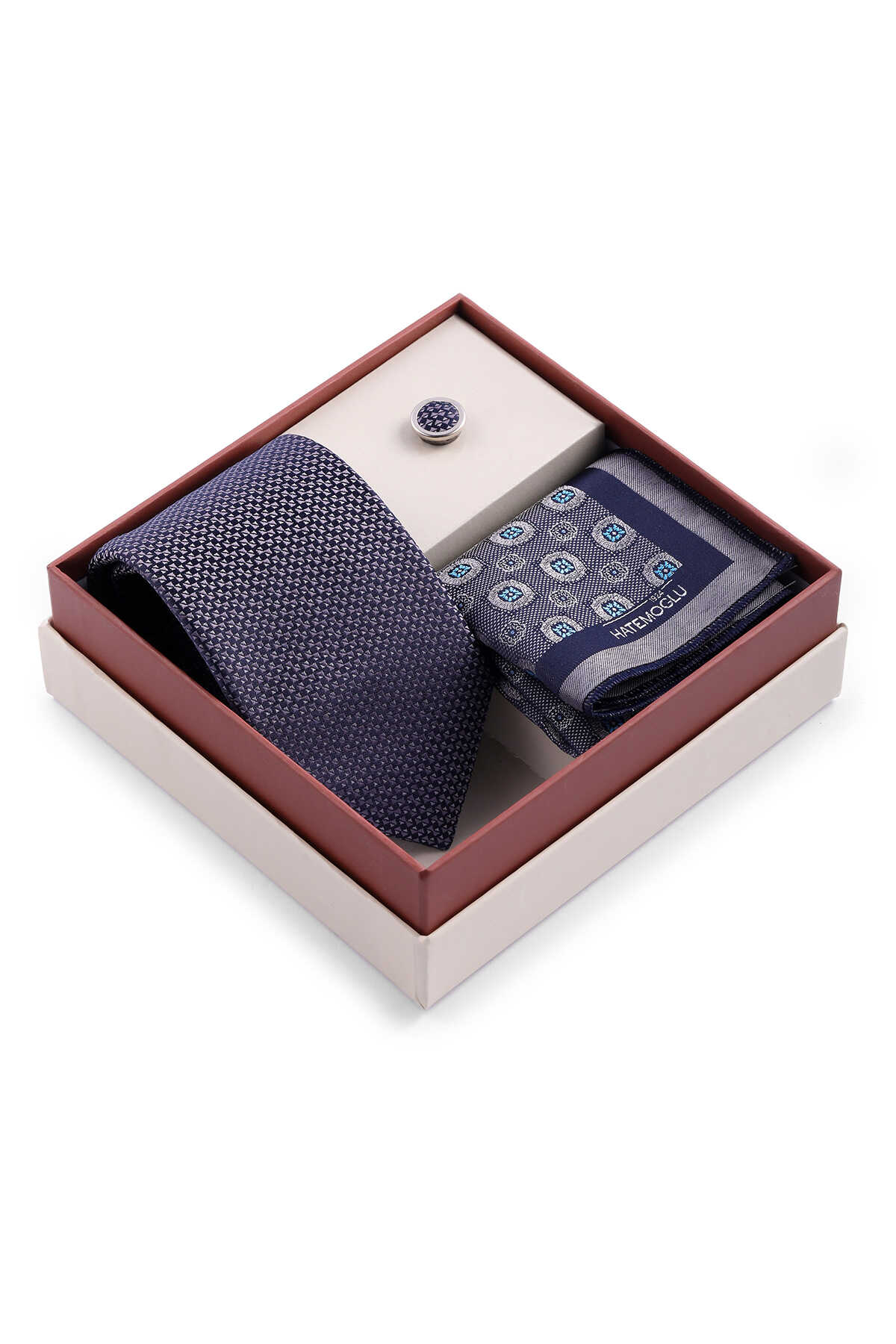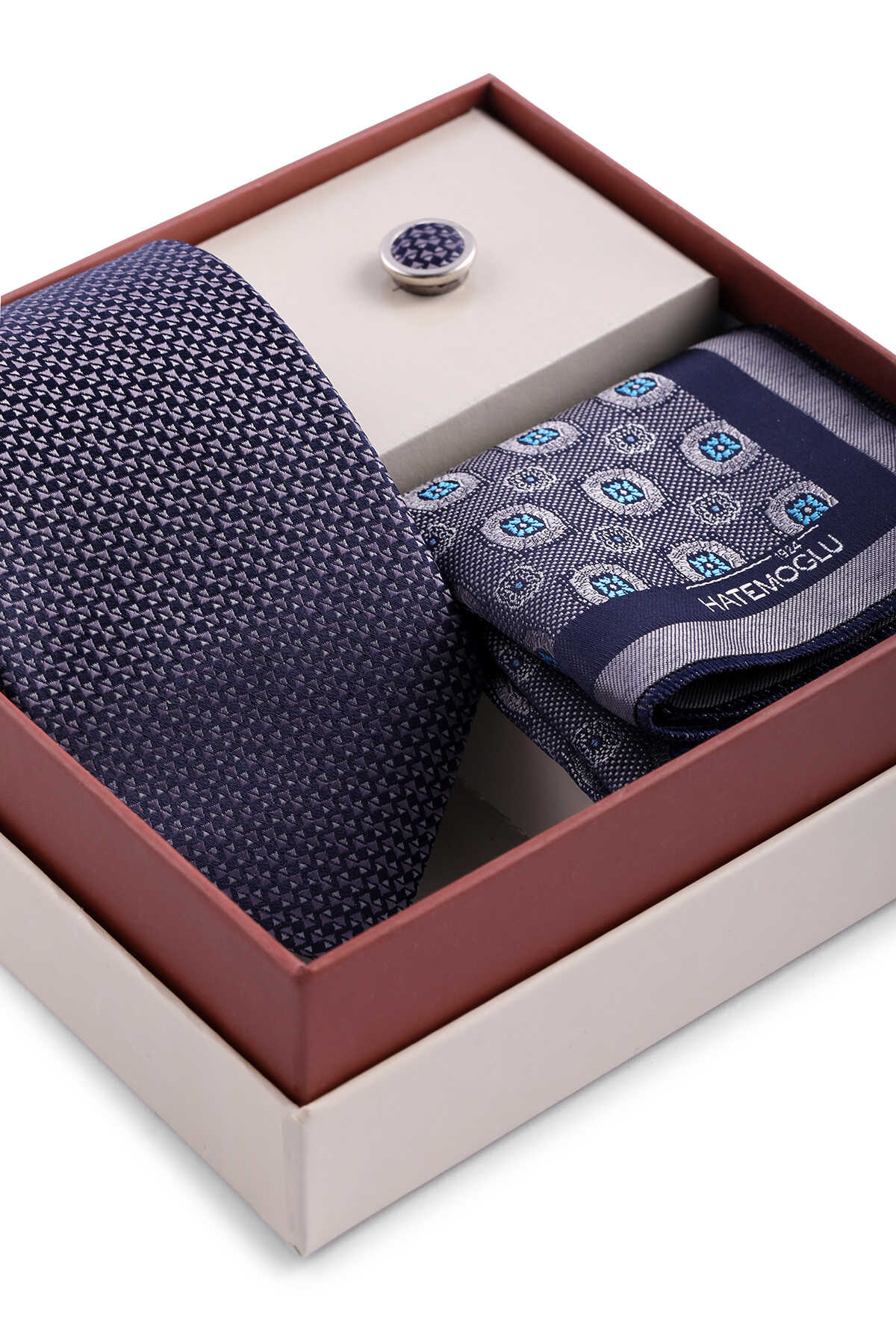 Lacivert Üçlü Yaka Rozeti Kravat Mendil Set