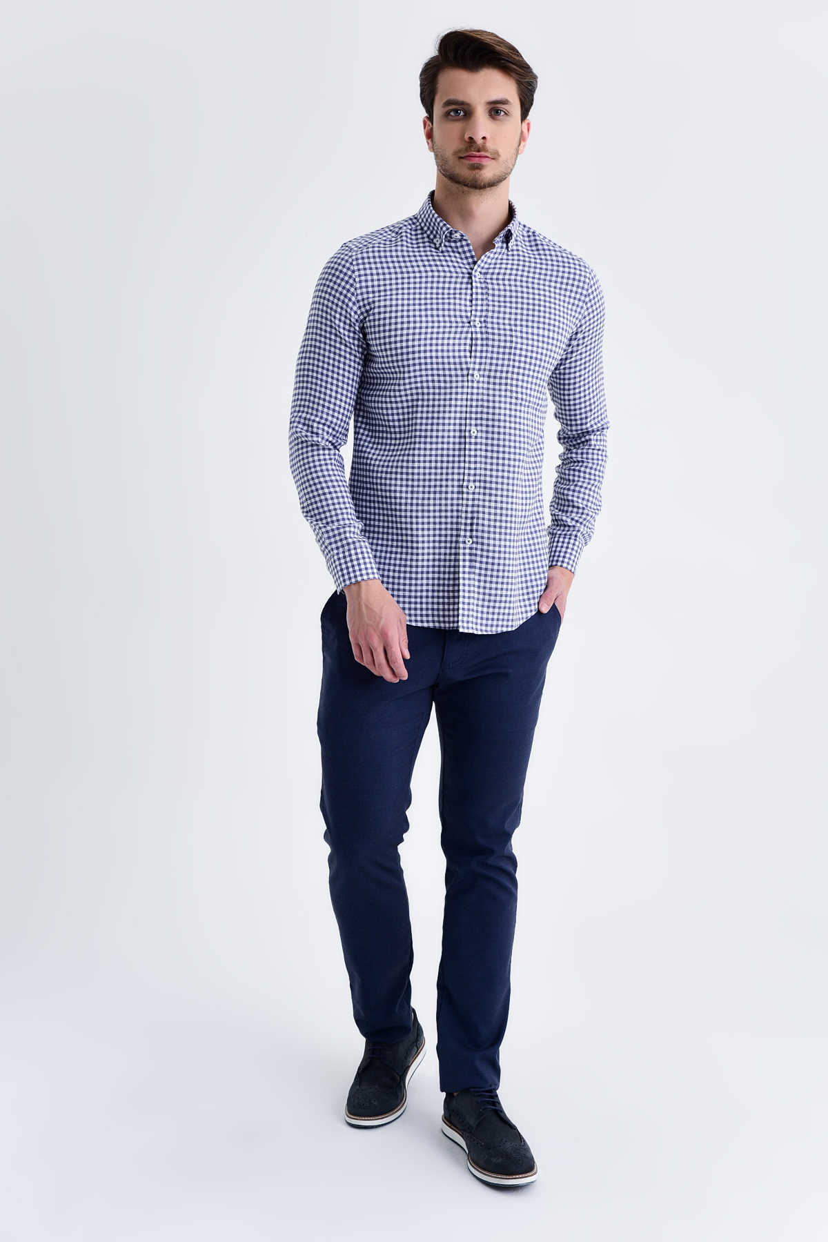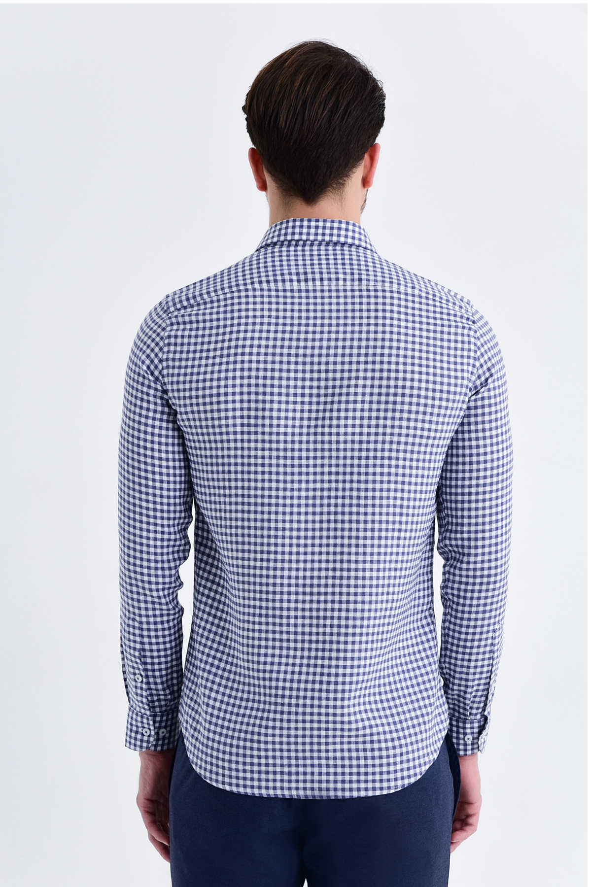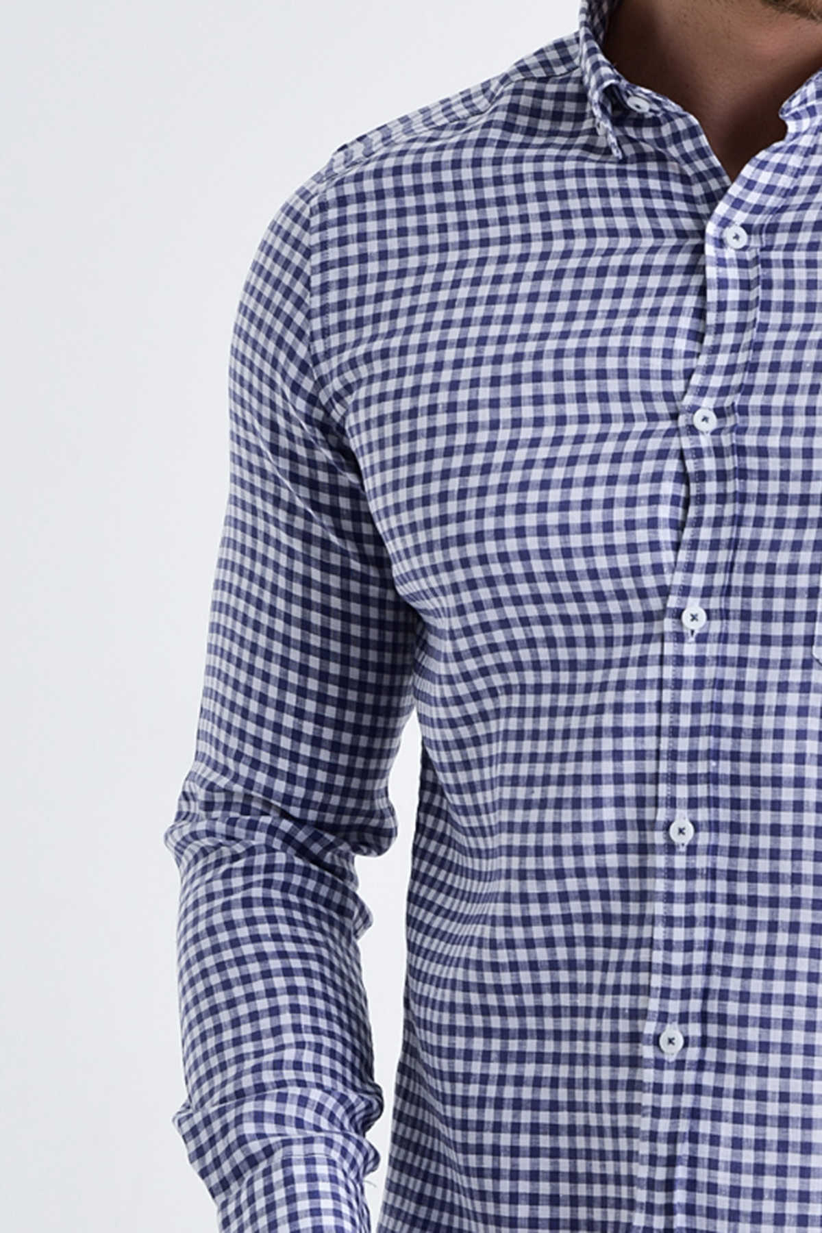 Lacivert Slim Fit Kareli 100% Keten Uzun Kol Gömlek