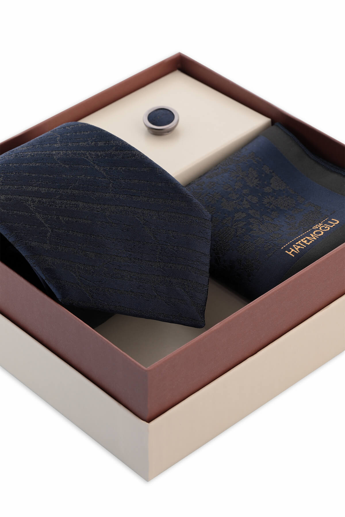 Lacivert Kravat Mendil ve Yaka Rozeti 3'lü Set