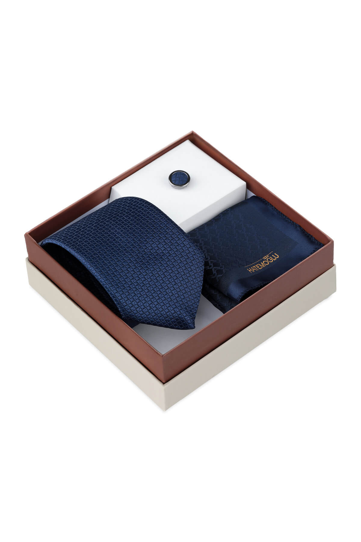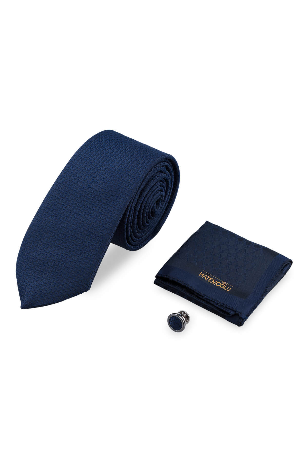 Lacivert Kravat Mendil ve Yaka Rozeti 3'lü Set