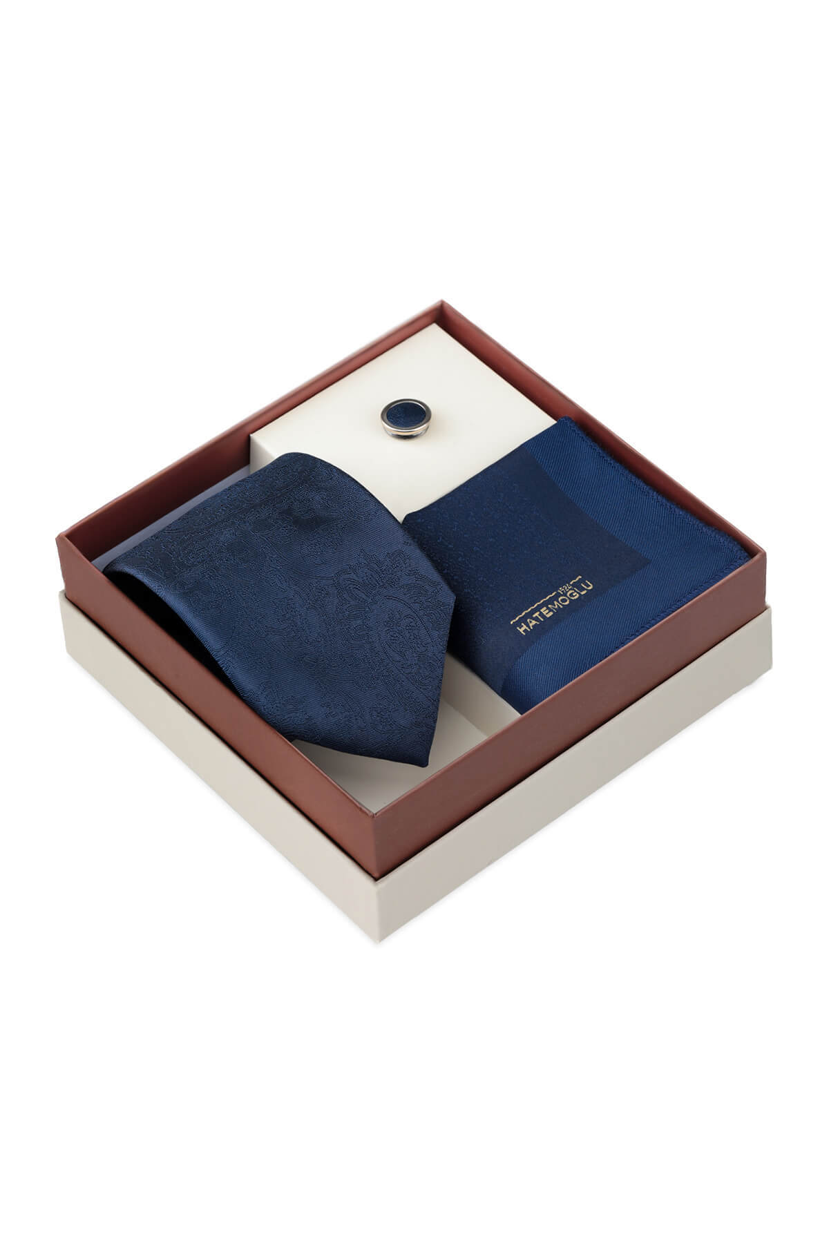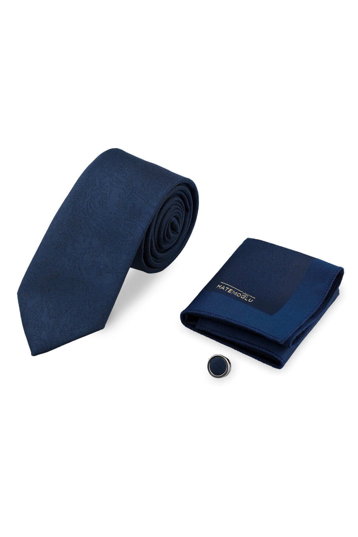 Lacivert Kravat Mendil ve Yaka Rozeti 3'lü Set
