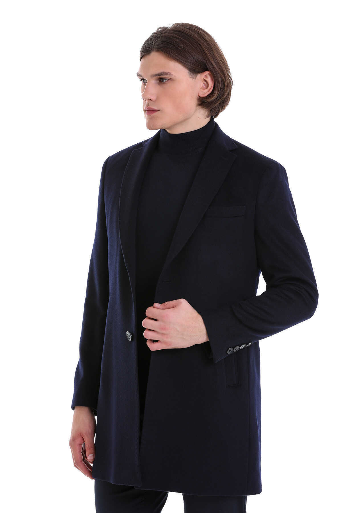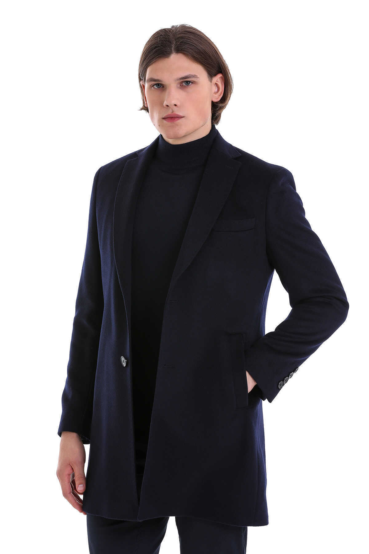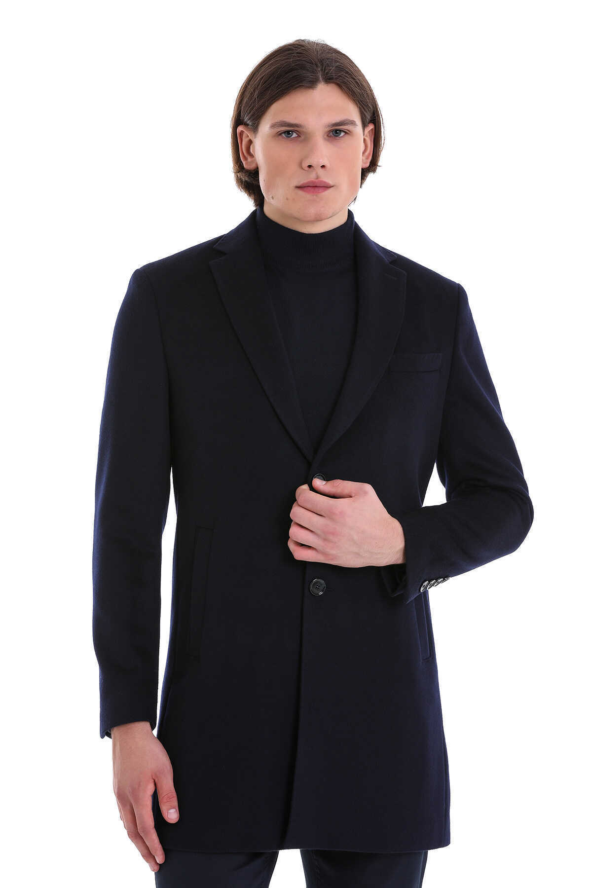 Lacivert Regular Fit Ceket Yaka Yünlü Basic Palto
