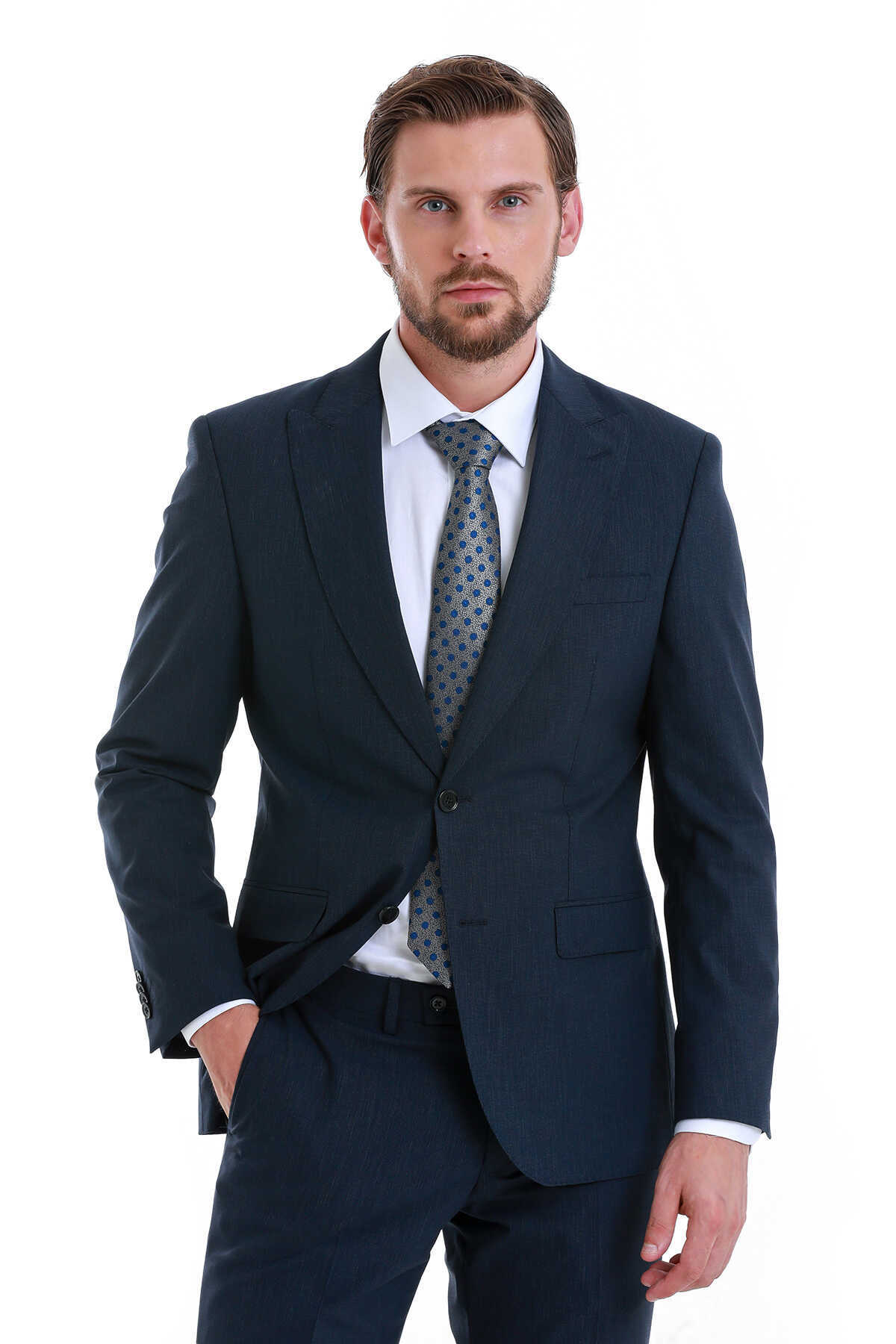 Lacivert Slim Fit Çizgili Sivri Yaka Klasik Takım Elbise