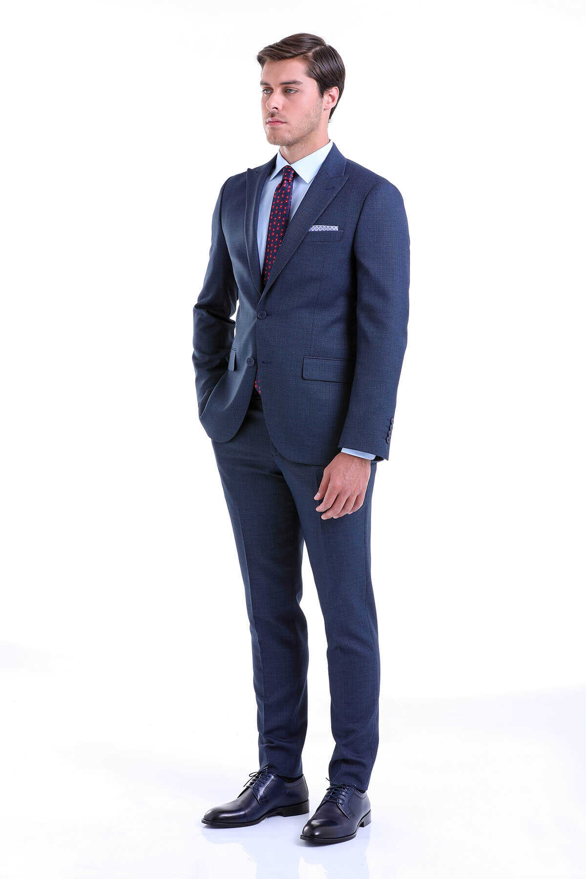 Lacivert Slim Fit Desenli Sivri Yaka Klasik Takım Elbise