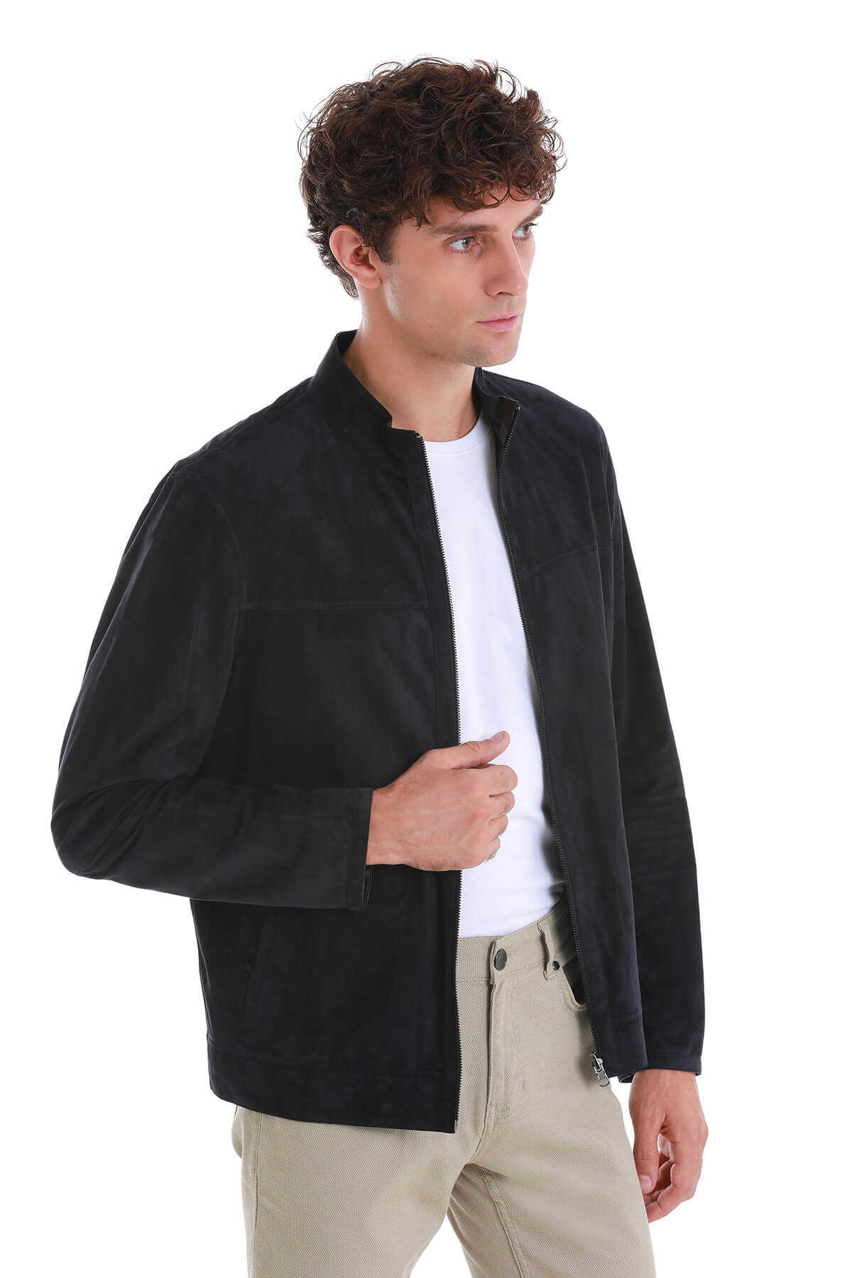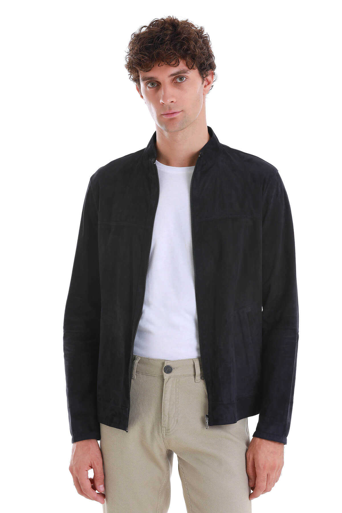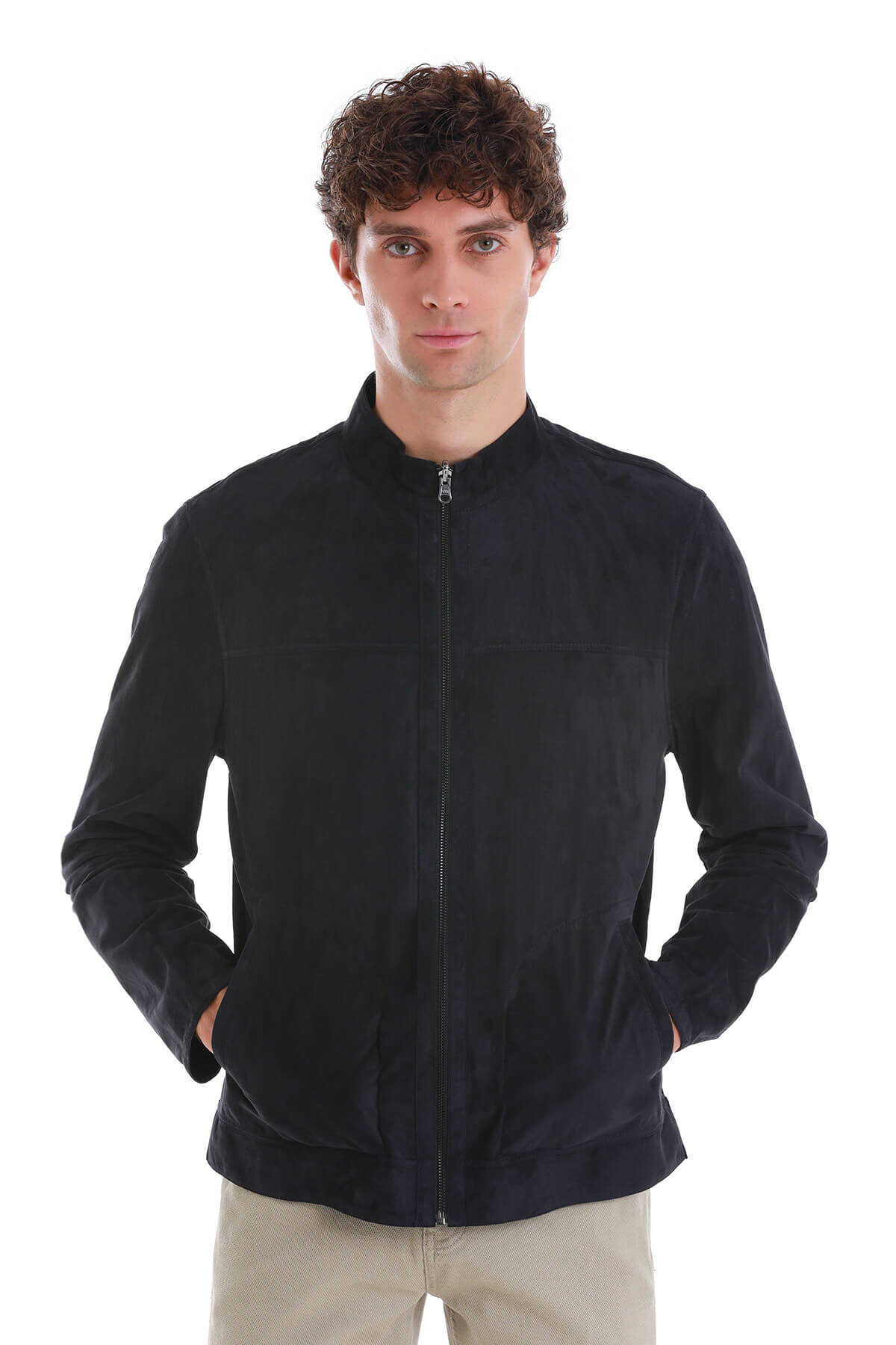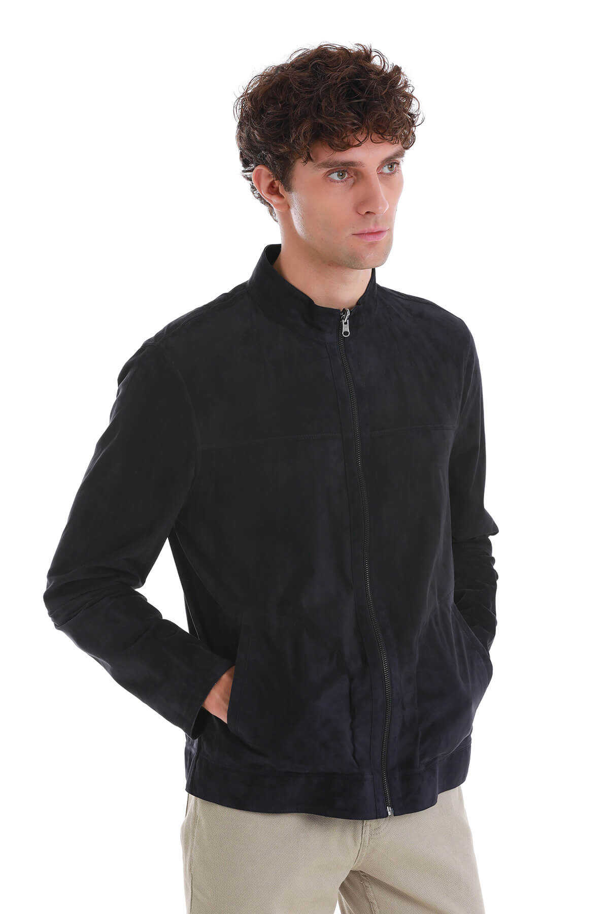 Lacivert Slim Fit 100% Deri Hakim Yaka Çift Taraflı Deri-Süet Mont