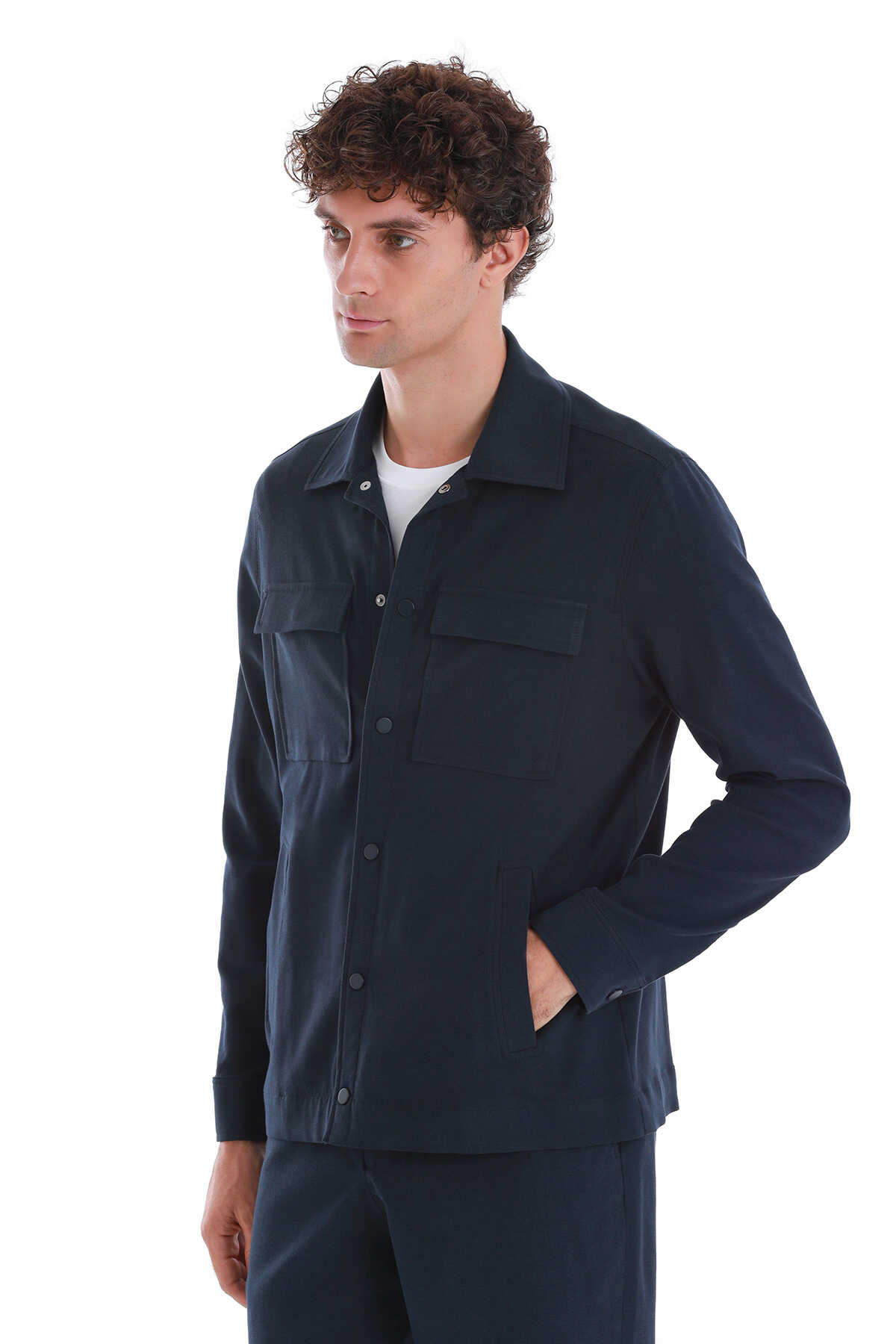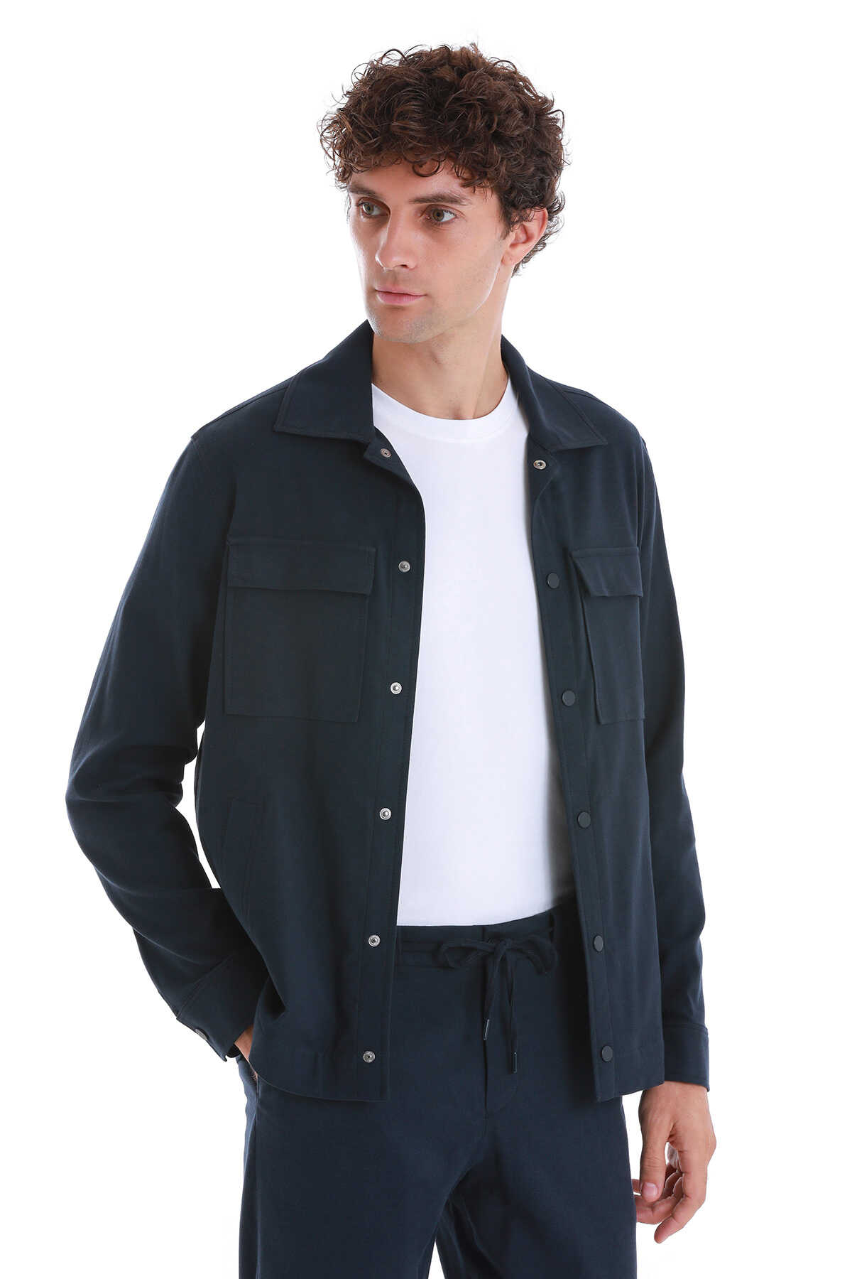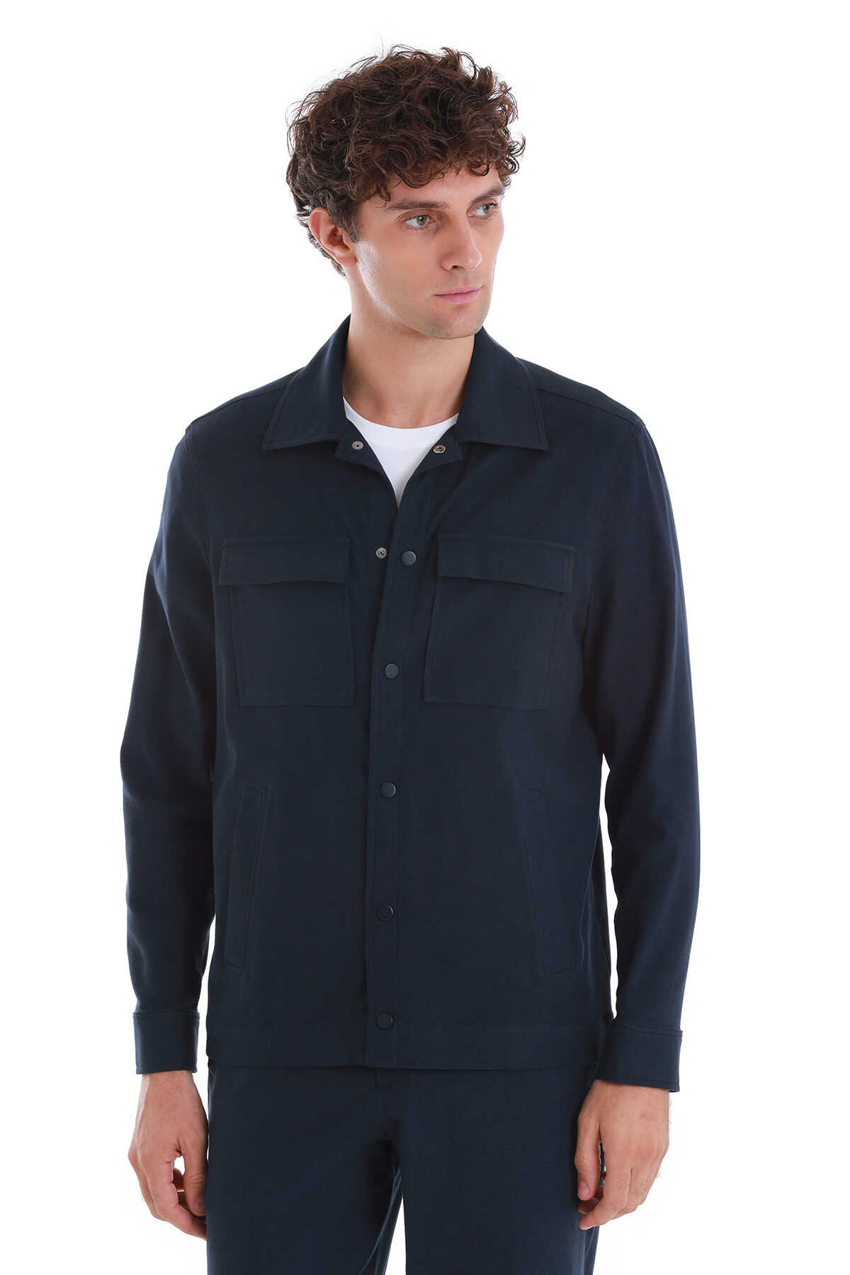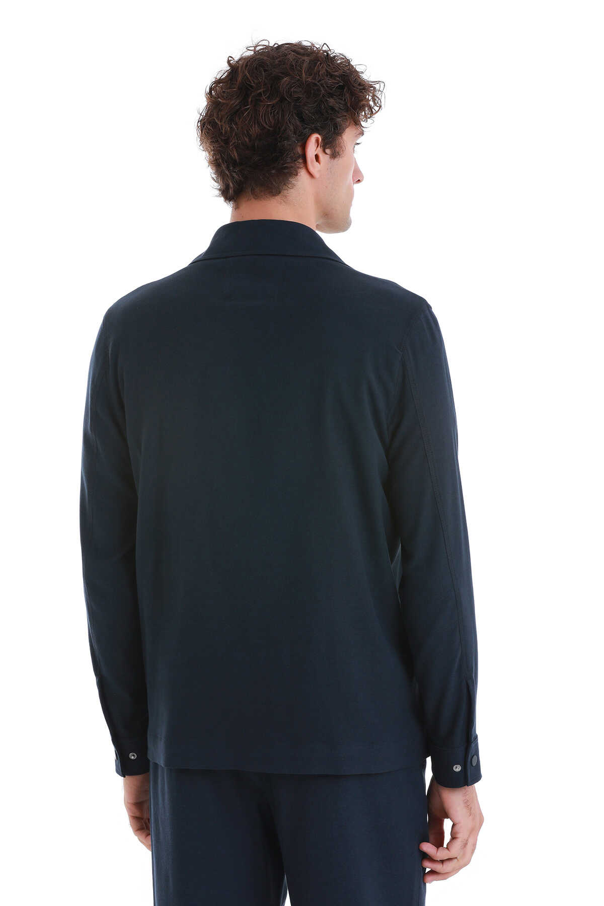 • Lacivert Slim Fit Düz Mono Yaka Pamuklu Overshirt Takım, overshirt şıklığını takım elbise dokusuyla buluşturan, hem rahat hem stil sahibi bir kombinasyondur. Mono yaka detayı ile sade ama dikkat çekici bir duruş sergiler.