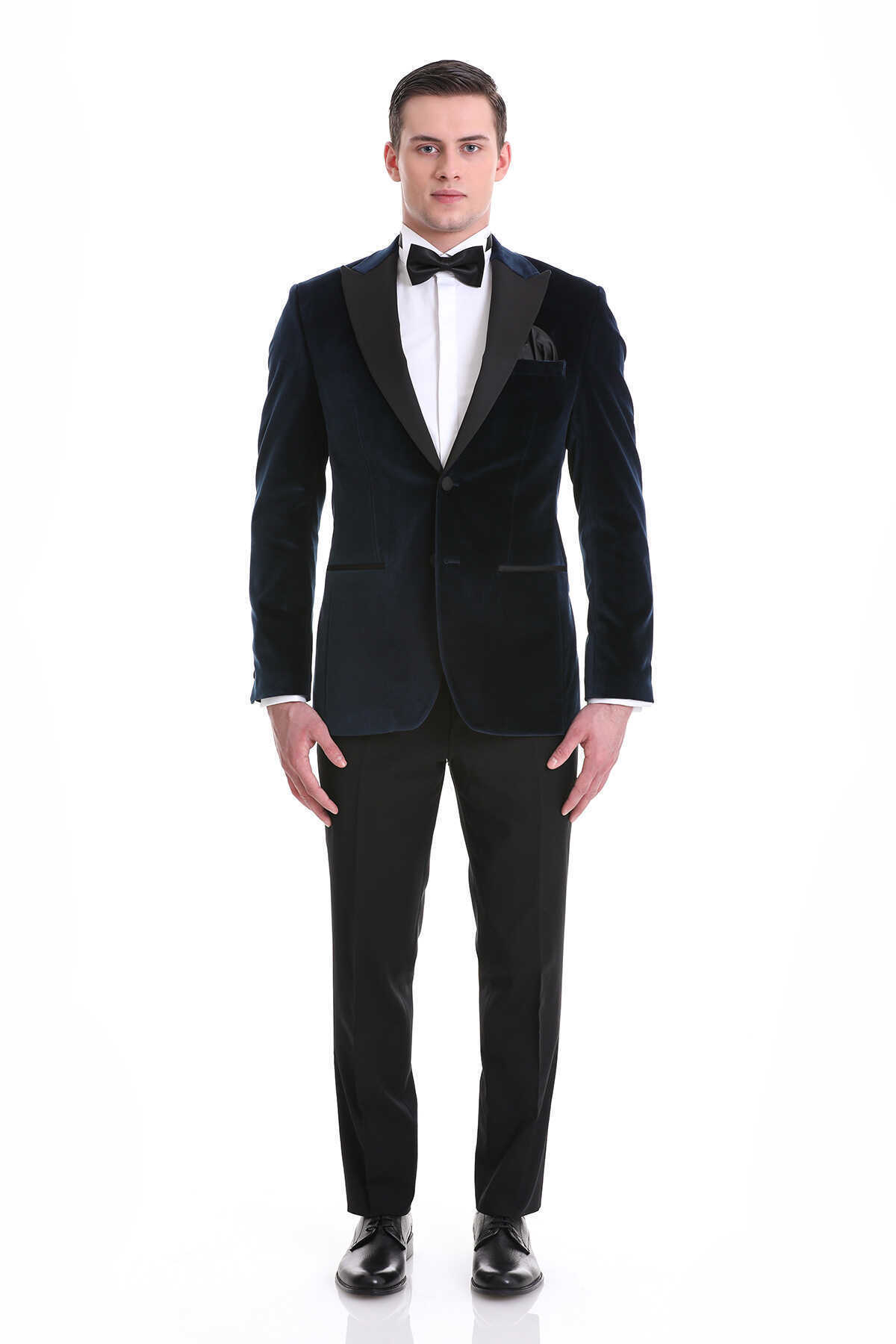 • Lacivert Slim Fit Düz Sivri Yaka Kadife Klasik Smokin / Damatlık, kadifenin lüks dokusunu lacivertin asil tonuyla birleştirerek özel günlerde dikkat çeken bir stil sunar. Slim Fit kesim vücuda oturur; düz deseni sade ama çarpıcı bir duruş kazandırır.