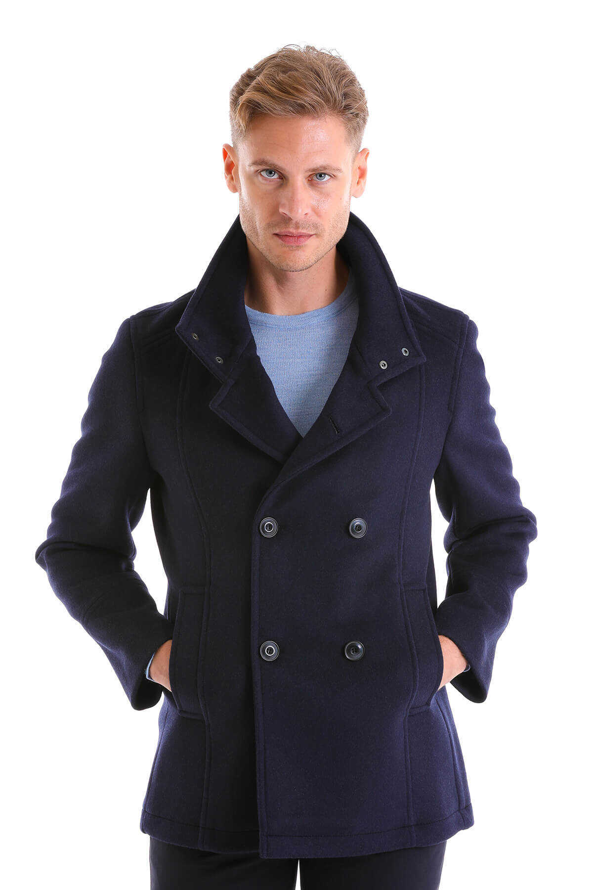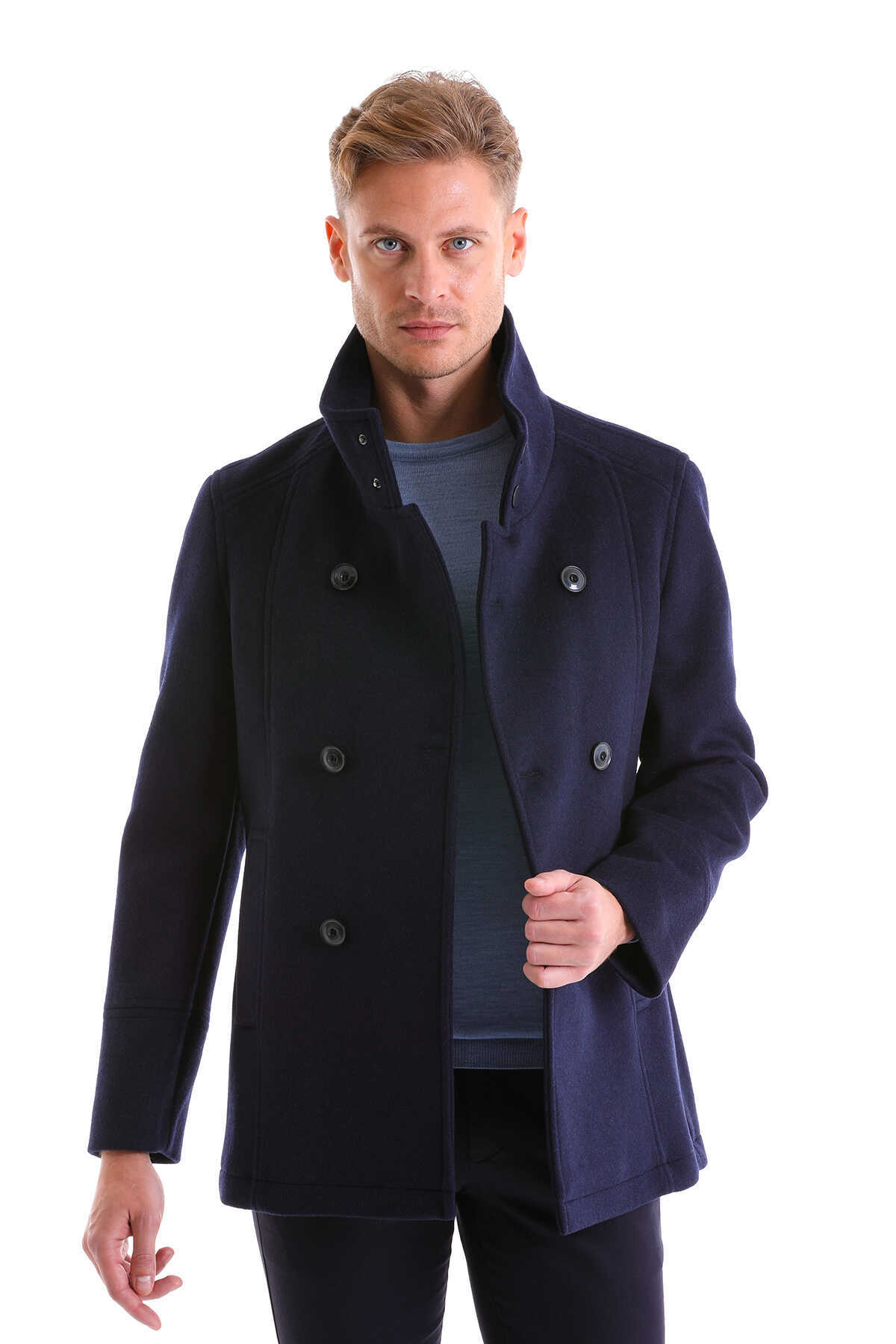 Lacivert Slim Fit Mono Yaka Yünlü Kruvaze Kaşe Kaban