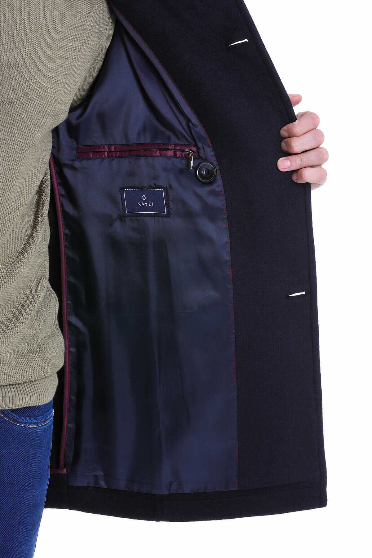 Lacivert Slim Fit Mono Yaka Yünlü Kruvaze Kaşe Kaban