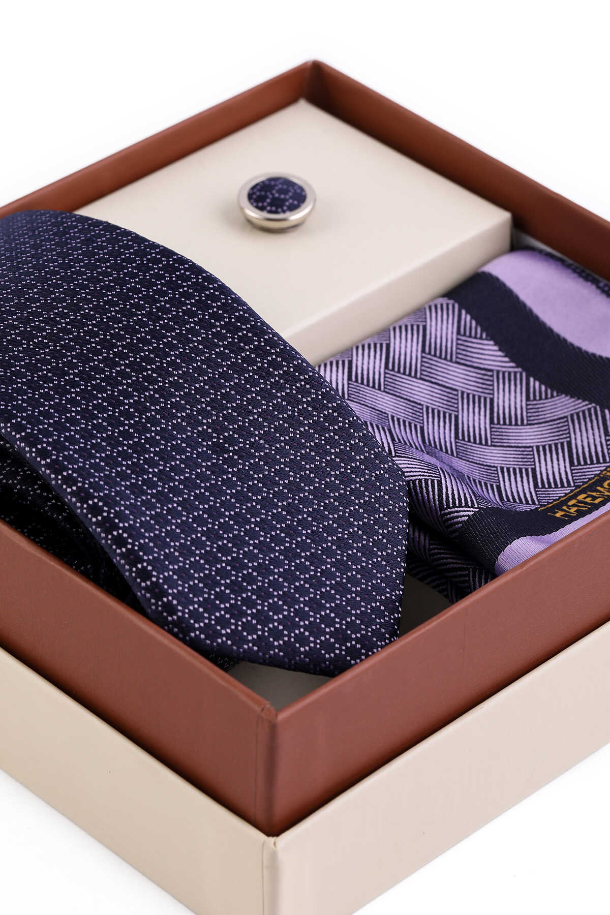 Lila Üçlü Yaka Rozeti Kravat Mendil Set